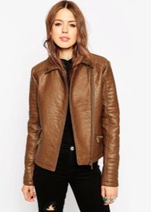 Dark brown jacket perfectly harmonizes with clothes of saturated colors. It can be worn with bright blue jeans or a satin dress. Do not forget about the contrast, to such a leather jacket fit light clothing.