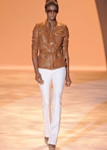 For office style, you can combine a brown leather jacket with a suit. The ensemble of a white blouse and a black pencil skirt looks very beautiful. Brown jacket perfectly complement such an elegant bow. Do not forget about straight cut trousers that are often used in business style.