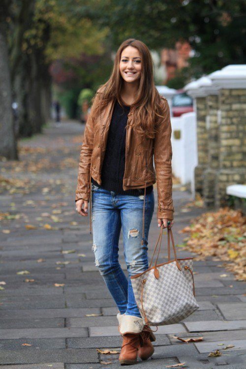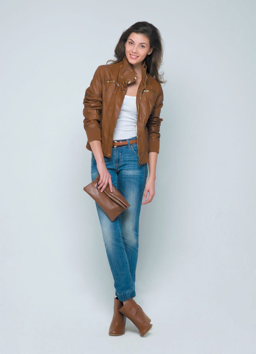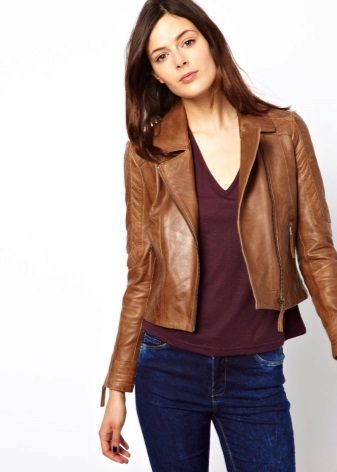 For girls, a combination of brown leather with jeans, leggings or a skirt is suitable for every day, while the top can be represented by a shirt or a tunic of a classic cut. Leather jacket looks great with a sweater or knitted dress.