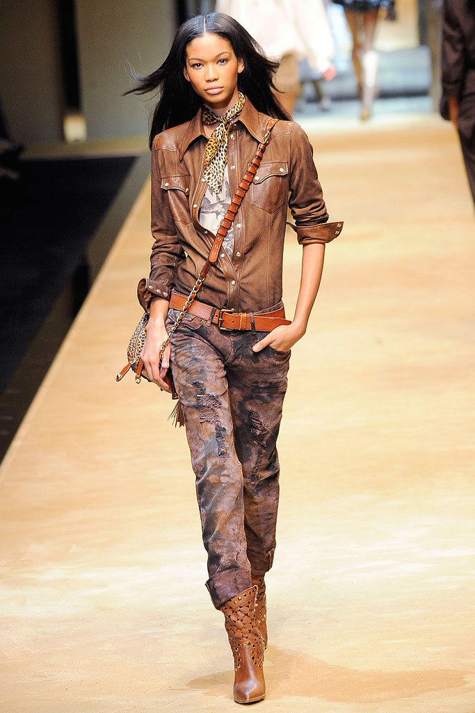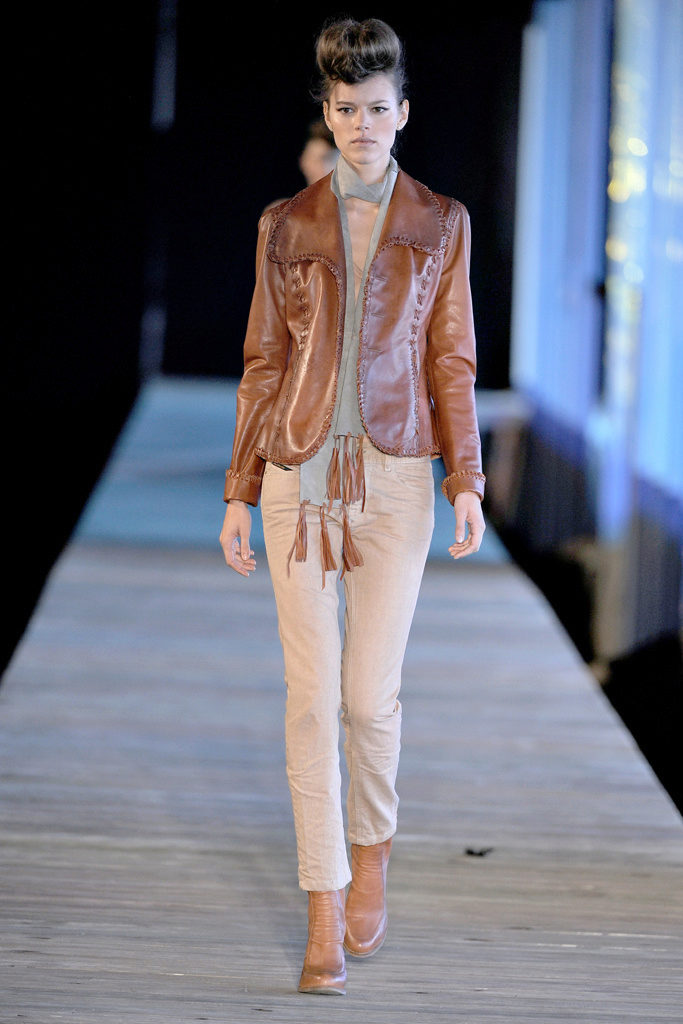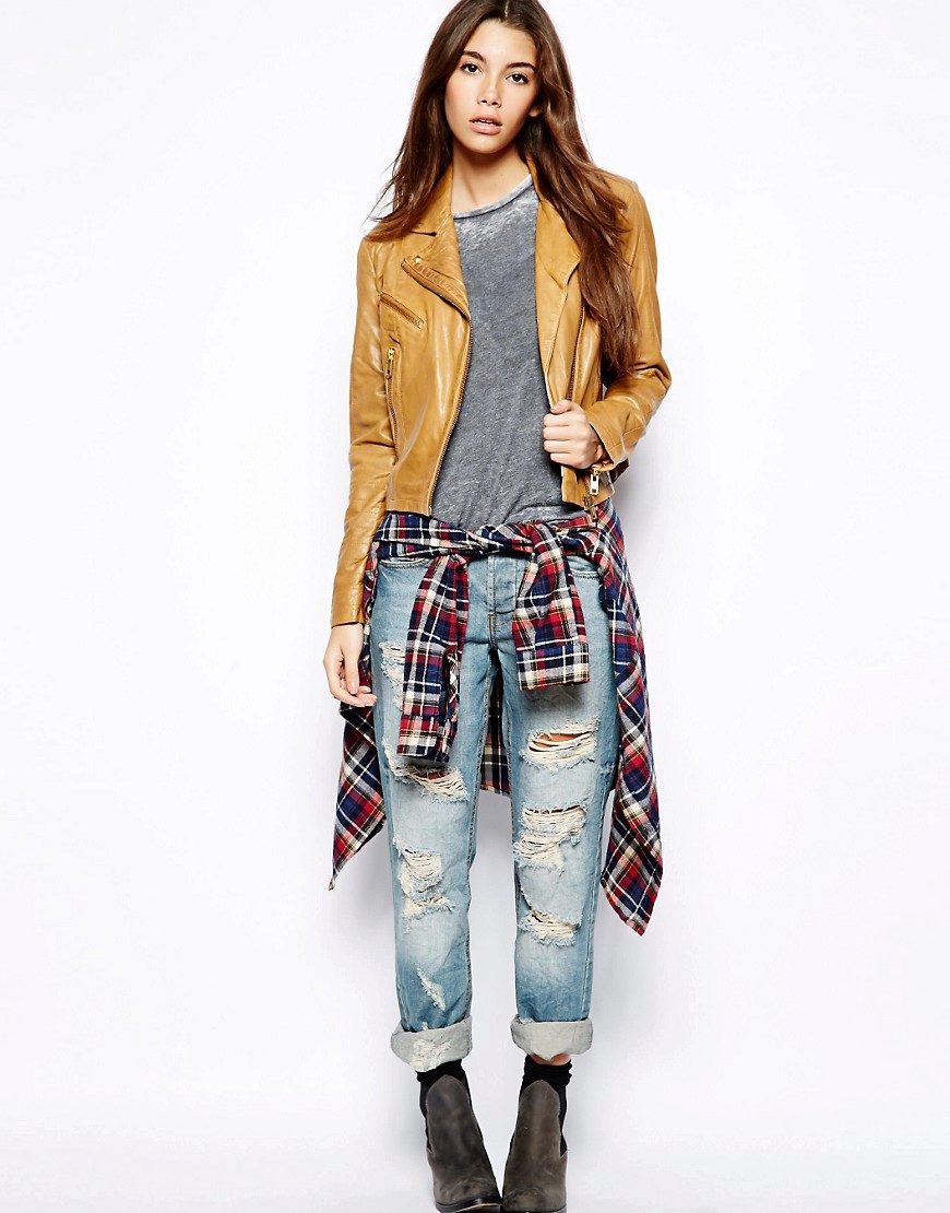 Brown leather jacket looks stylish in the style of boho. It should be worn with a skirt in several layers of lightweight material and with a top in tone with a jacket. Narrow leather boots harmoniously fit into this style, and wooden decorations will complement fashionable bow.
