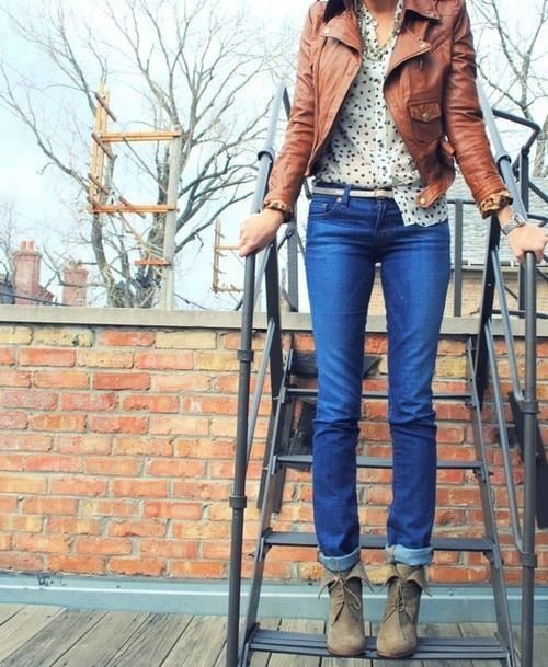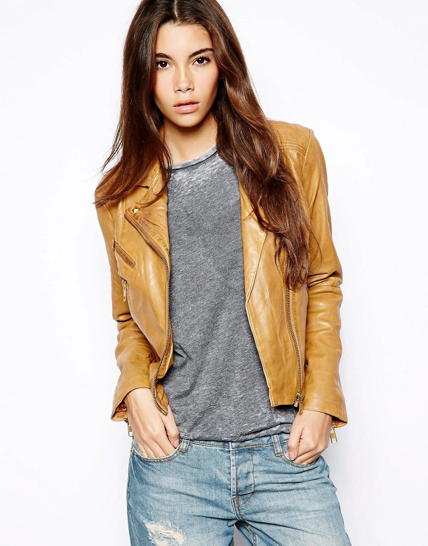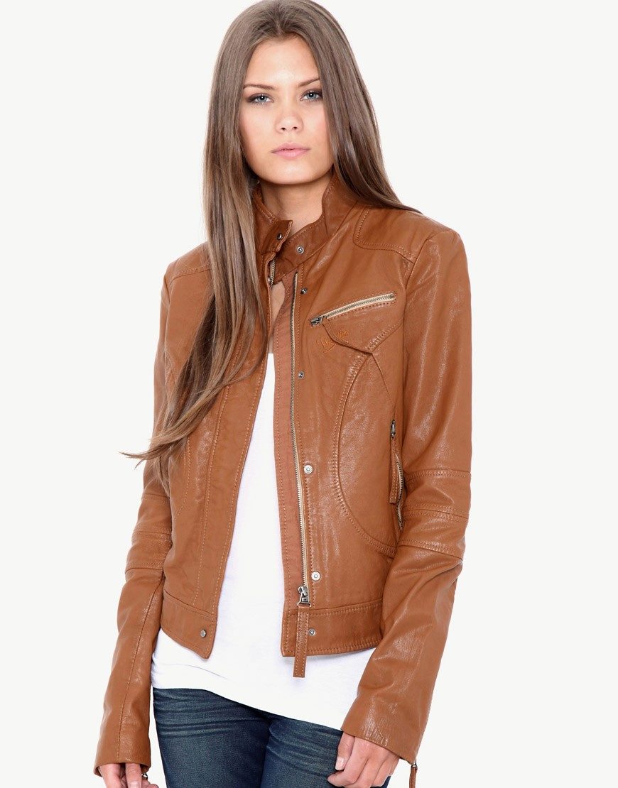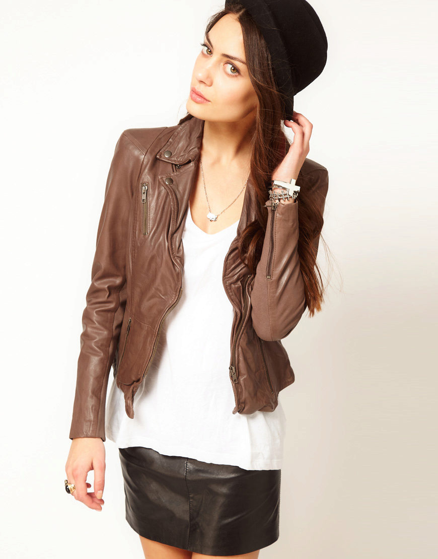 Brown leather jacket looks beautiful on blondes, brunettes and brown-haired women, but it is especially suitable for red-haired girls. The brown color has many shades, so every woman of fashion can find that tone that will emphasize her personality and beauty.