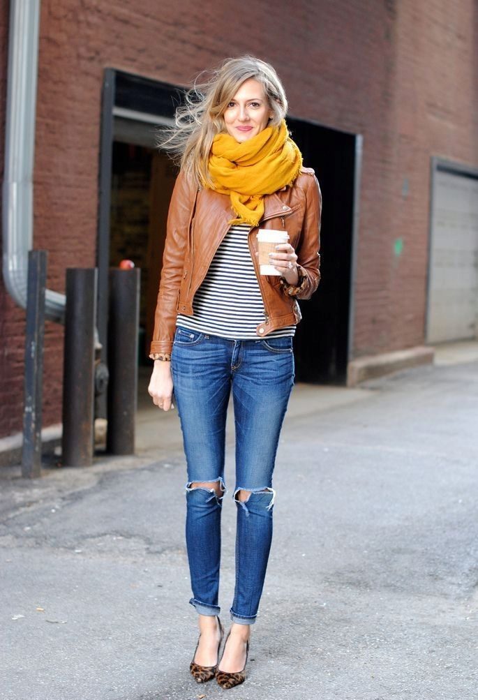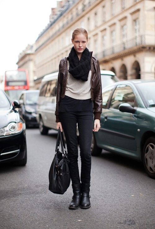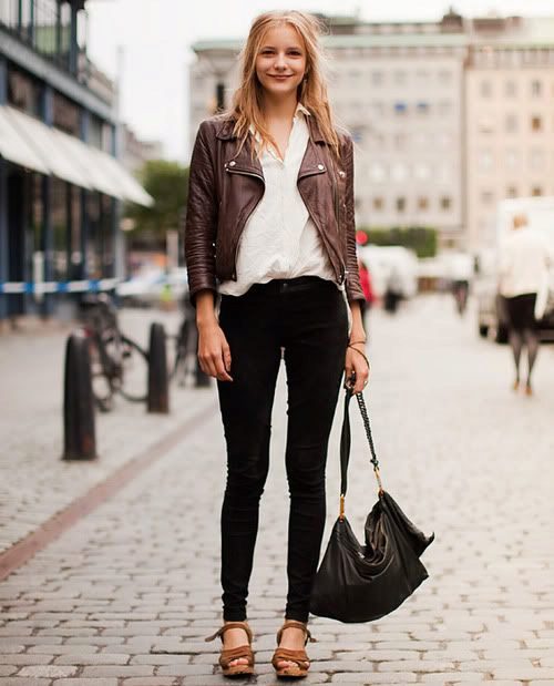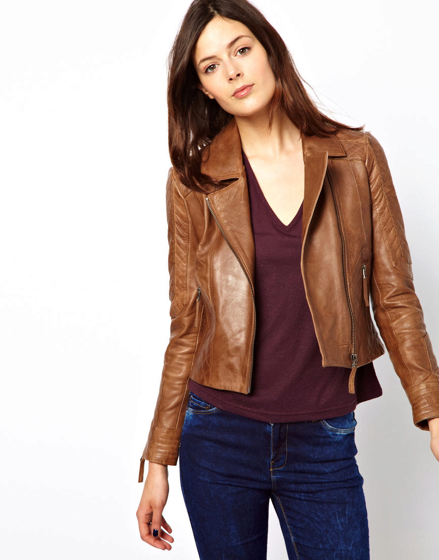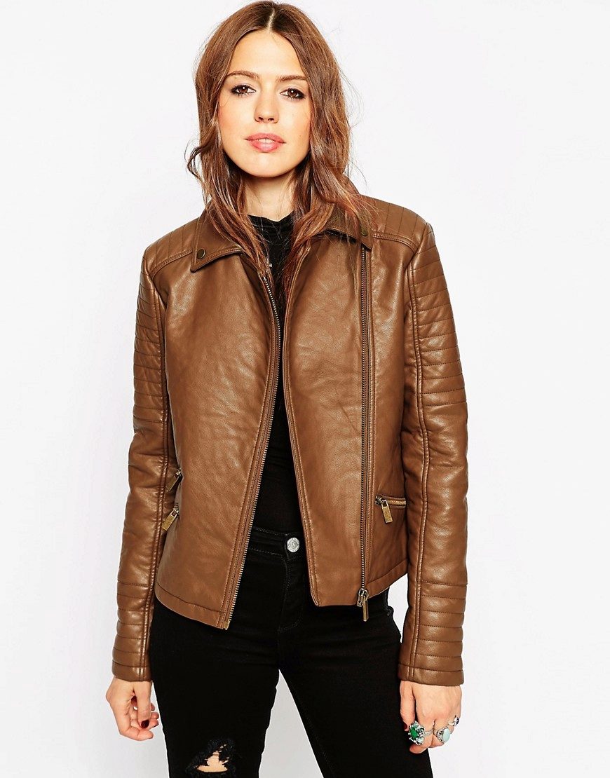 Brown leather jacket looks beautiful on blondes, brunettes and brown-haired women, but it is especially suitable for red-haired girls. The brown color has many shades, so every woman of fashion can find that tone that will emphasize her personality and beauty.