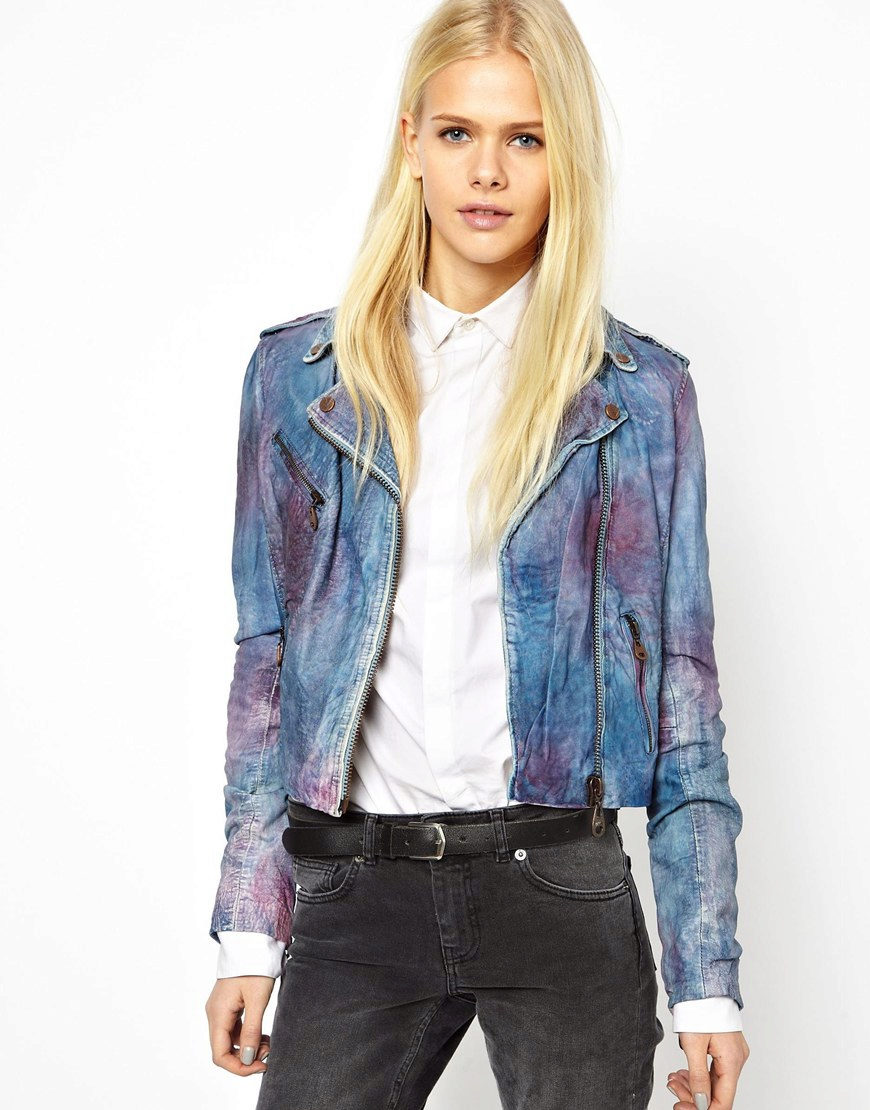 When choosing a jacket-biker jacket in a biker style, it is worth buying jeans with a high waist.Prints in the form of scuffs on their fabric will give you the look of a rebellious rocker, released from the 70s, a free and charismatic contemporary of the Beatles.