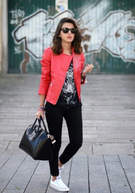A red leather jacket in any bow will be an item worth emphasizing. In this case, the blouse and pants are neutral, and the addition to the image is a bulk bag of black leather. Perhaps a great option for shopping.