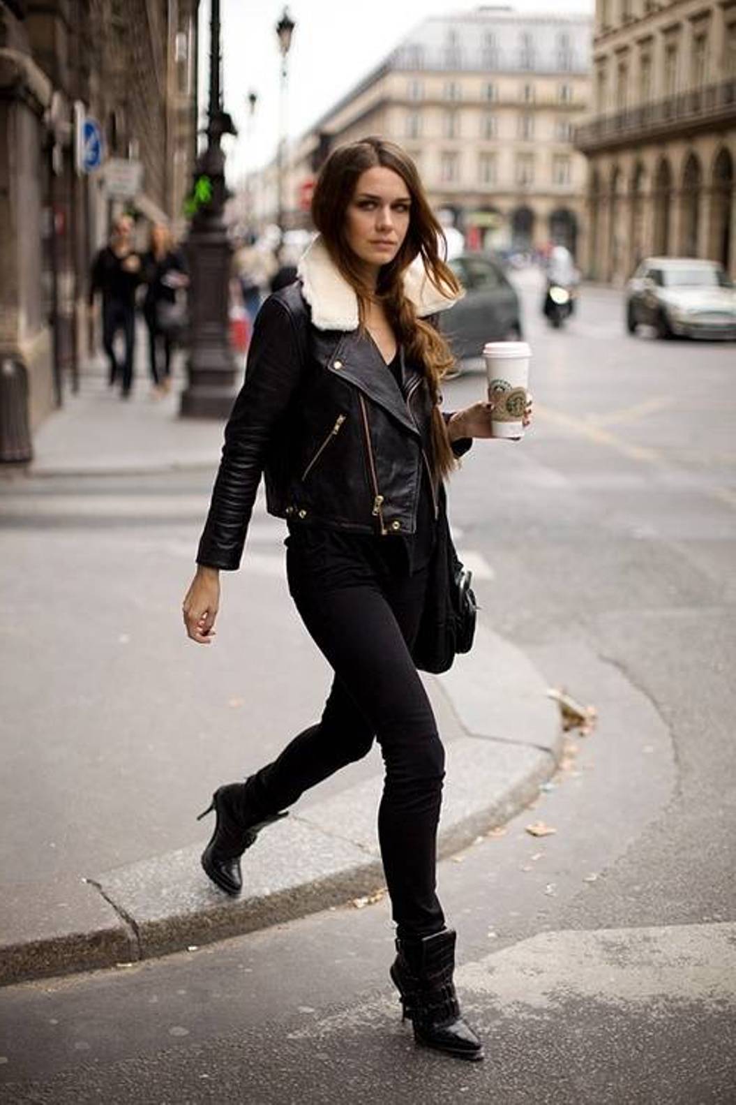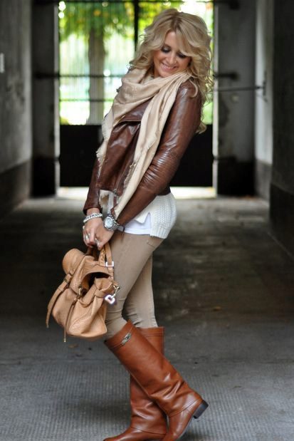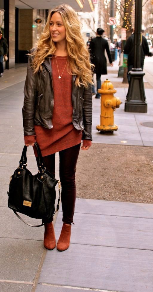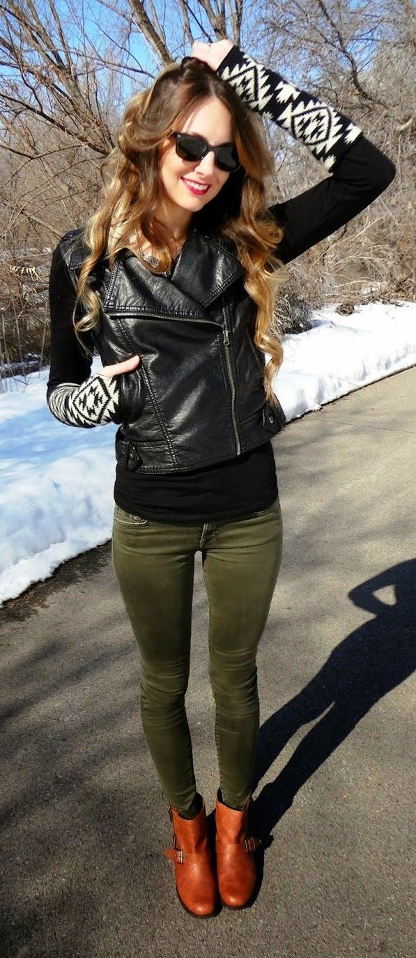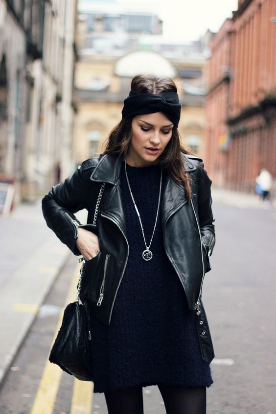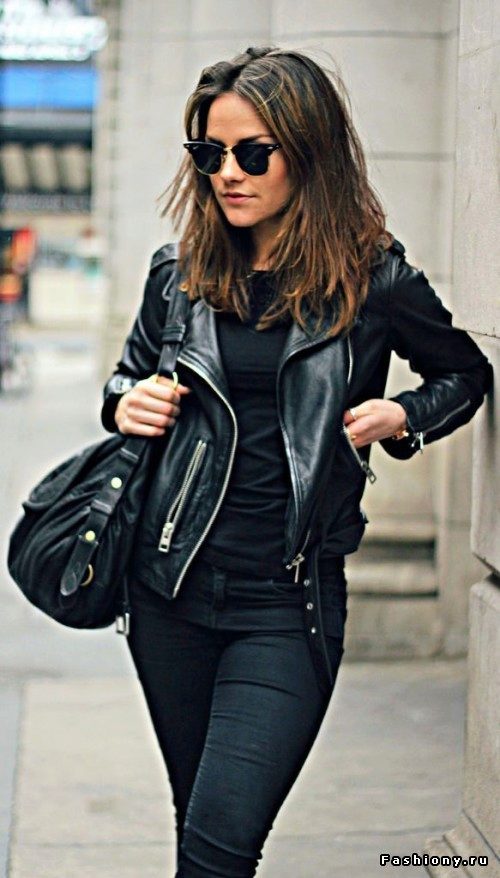 With a black jacket, tonal shoes, dark leggings and a light tunic will look beautiful. You can embody an unforgettable ensemble with a turtleneck or a brown blouse, narrow black pants and suede boots. But it is worth limiting yourself in the selection of clothes, because a black leather jacket will look beautiful with any element of the wardrobe, so you should rely on your taste.