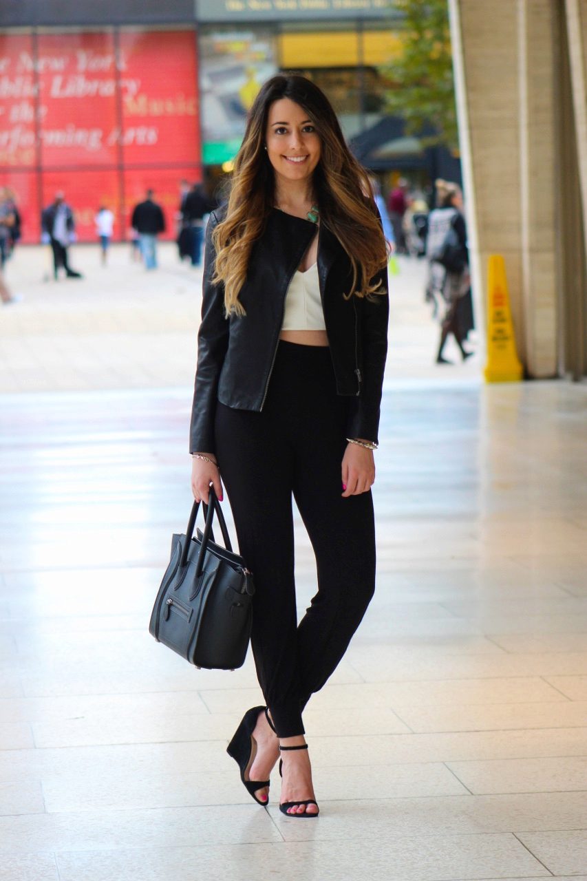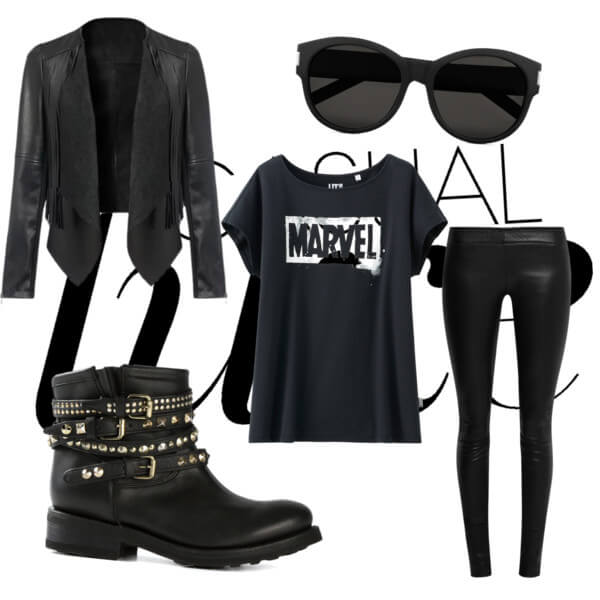 You can create a spectacular look with a combination of black leather leggings, jackets and t-shirts. Flat boots will help to complement the bow.