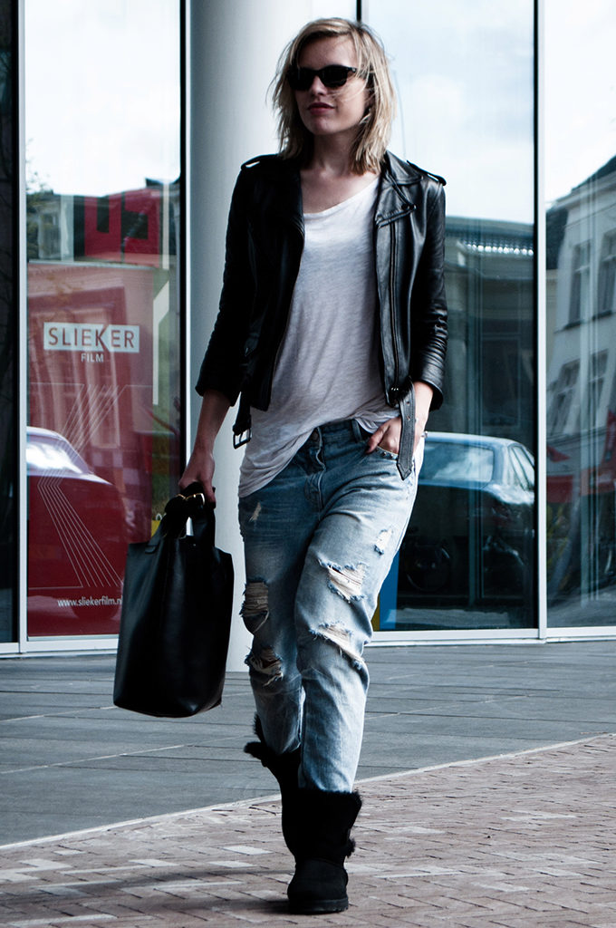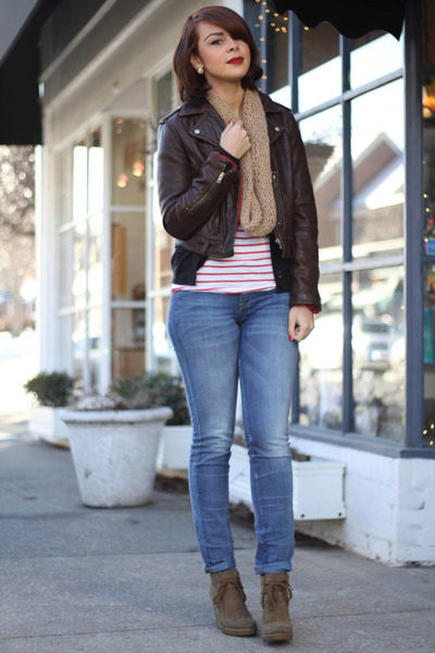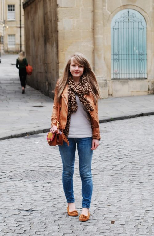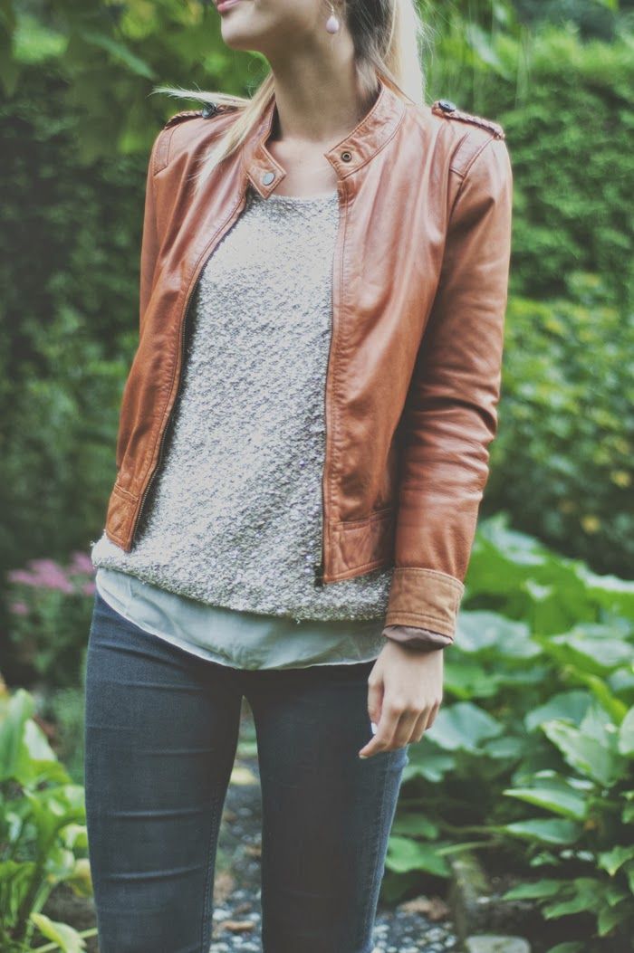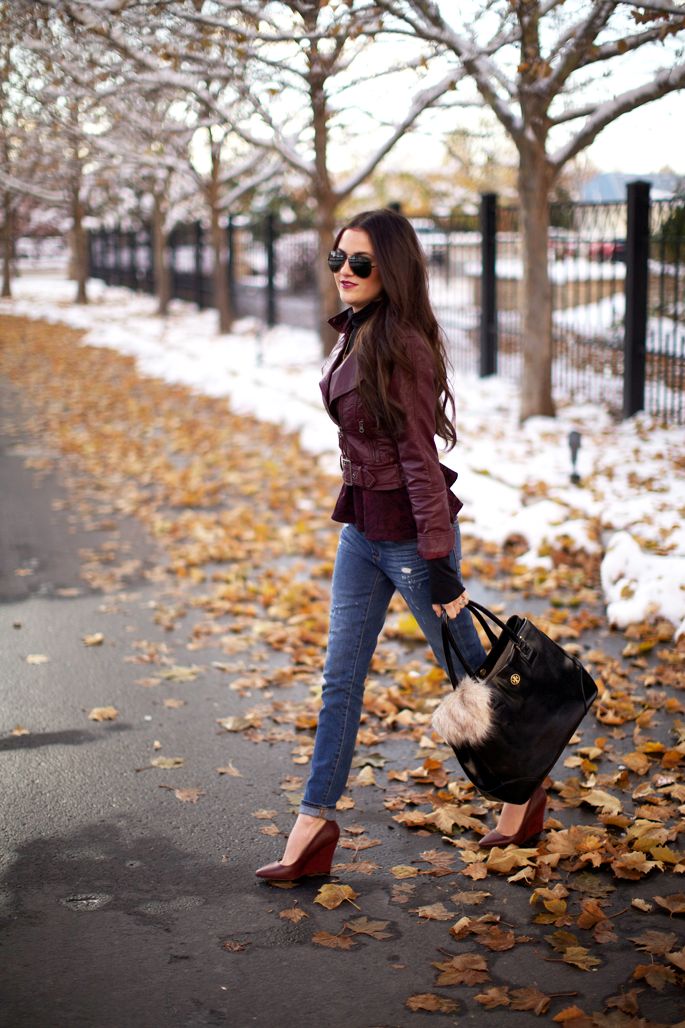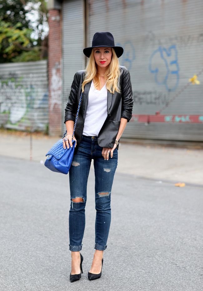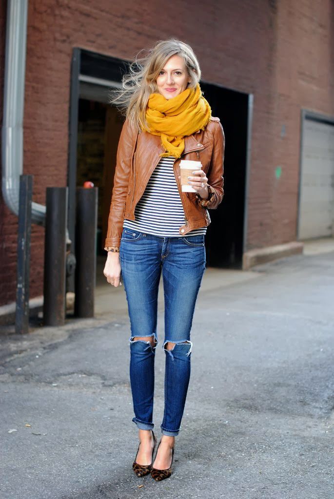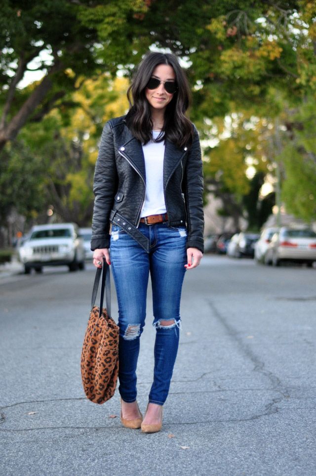 For a casual look, a leather jacket can be worn over a shirt. Trendy jeans and moccasins perfectly complement the bow for every day.