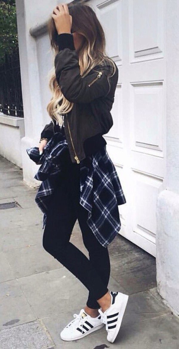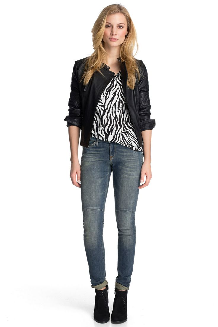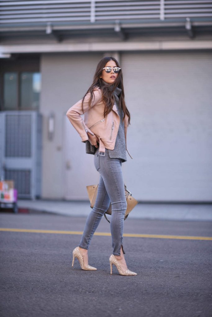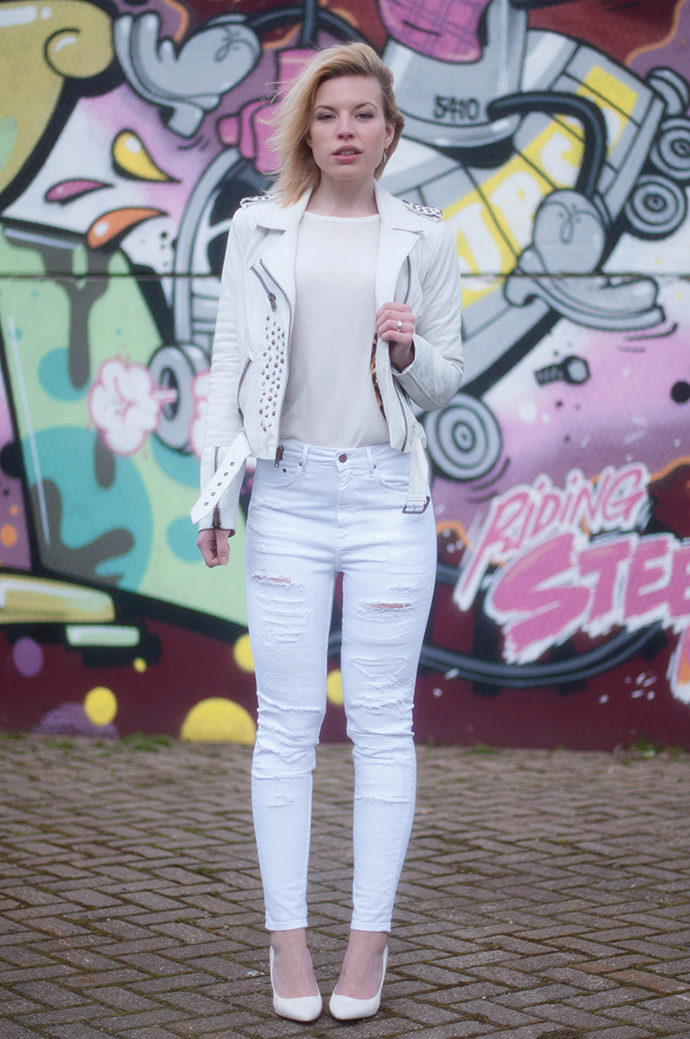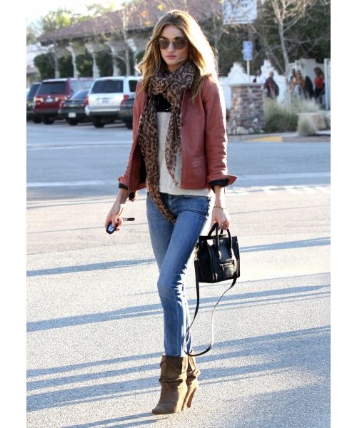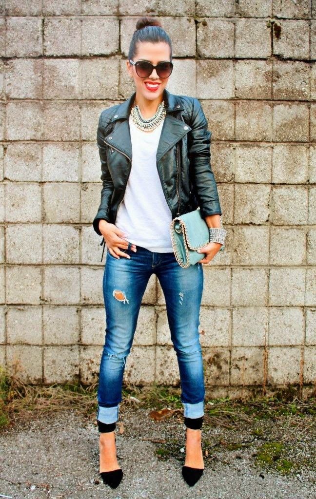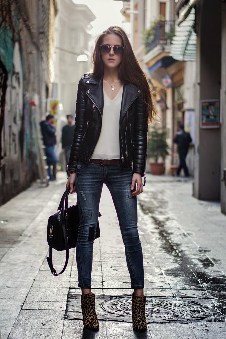 The leather jacket looks great with a khaki skirt or jeans, so it is perfect for creating an image in a military style. If you need to soften the bow, then a combination of white top and dark bottom will do. Stiletto heels are a luxurious, feminine look.