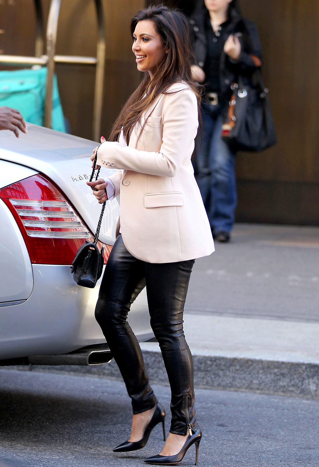 Stiletto shoes add a touch of sophistication.