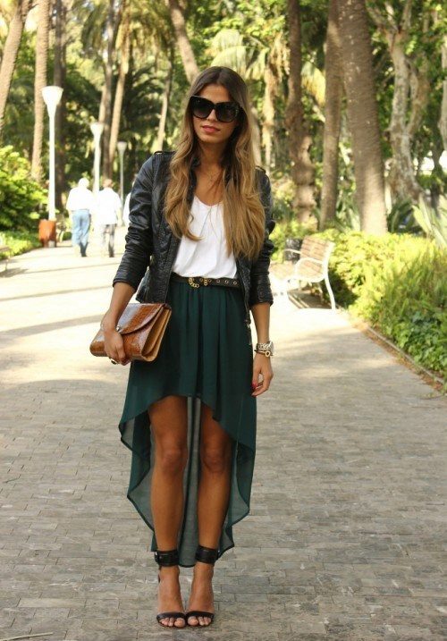 Leather jacket can be worn with both short and long skirts. Shoes should be matched to the color of the skirt.