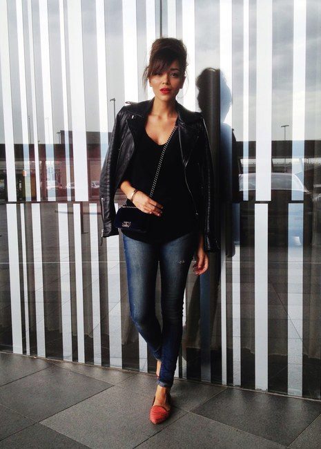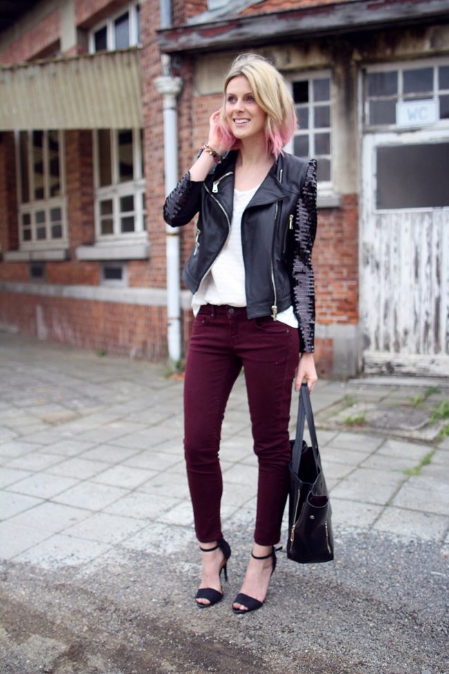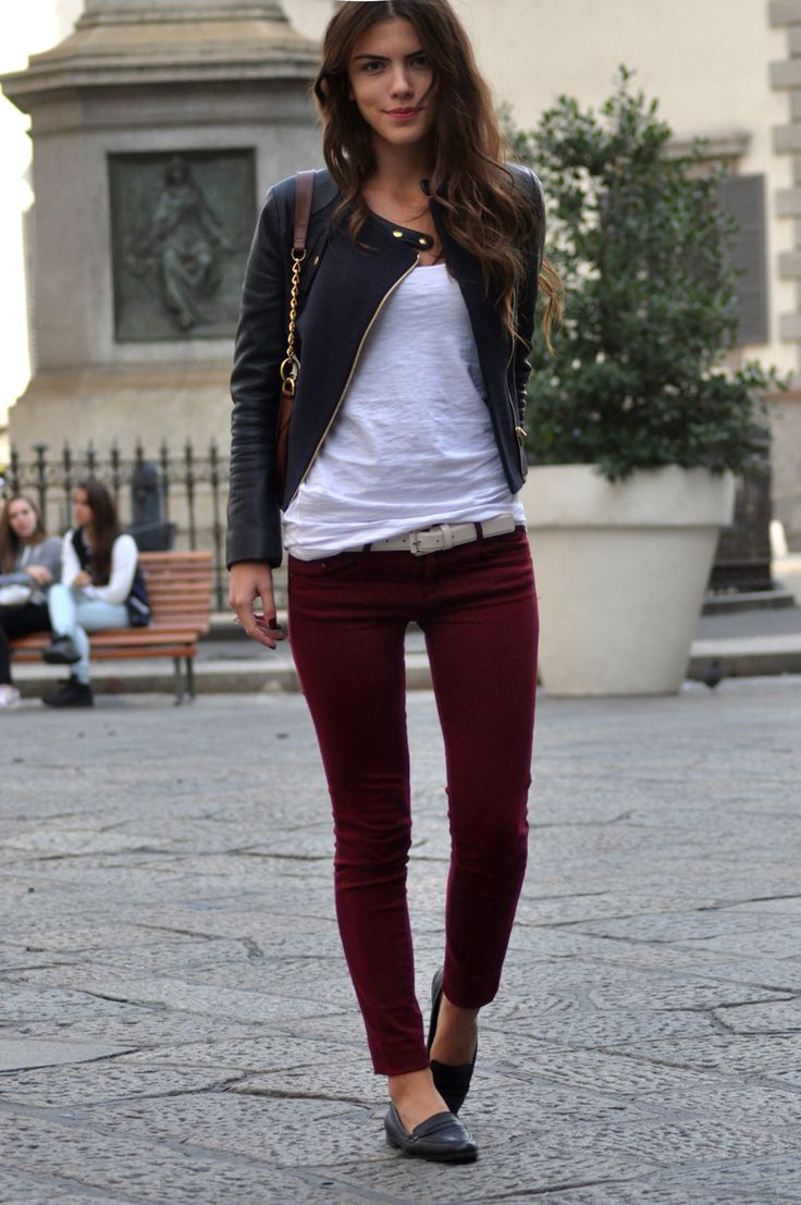 In any ensemble of a black leather jacket, the main role is assigned. For a spectacular look, you should combine it with red jeans or trousers, a snow-white T-shirt and boots to match the top. A black leather handbag will help to complement the bow.