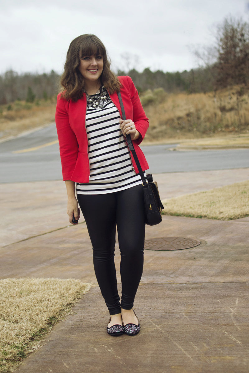 Leather skirt blends beautifully with a red dress above the knee. Black shoes and handbag complement a stylish bow.