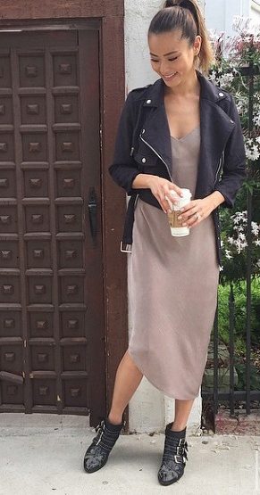 A cropped leather jacket is called universal, because it can be combined with a variety of things. The choice of wardrobe items depends entirely on your preferences. This style looks great with different dresses, from light or thick fabrics.