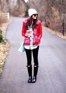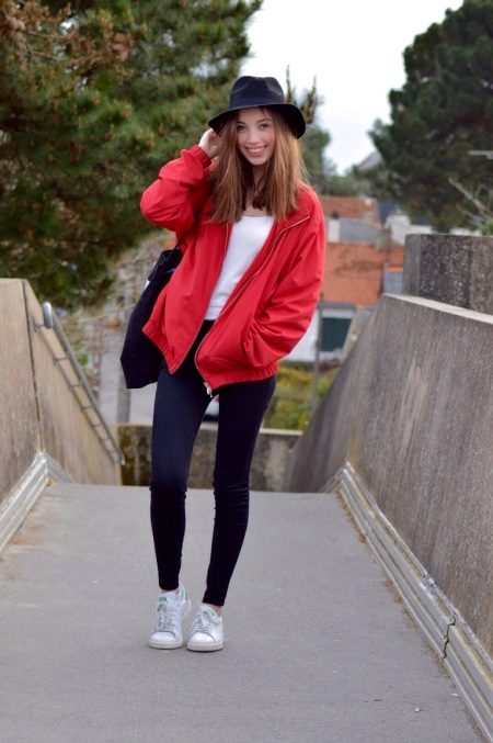 Black bottom (skirt, pants or jeans) in combination with a white T-shirt (sweatshirt) and a red leather jacket firmly entrenched in everyday life in most urban fashionable women. What you should pay attention to: do not mix sportswear with a classic red jacket.