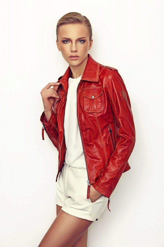 The length of this jacket comes to the hips. To emphasize the waistline, designers used a belt. He may be in the tone of a red leather jacket, and may differ in color and texture. Some models of jackets on the belt are decorated with natural fur.