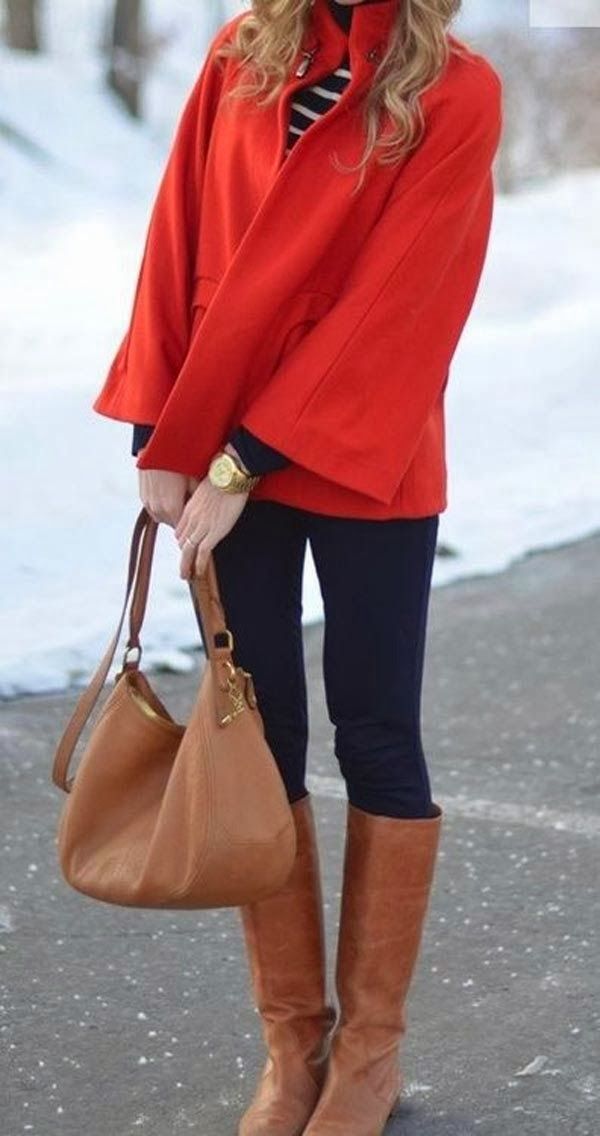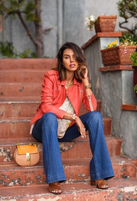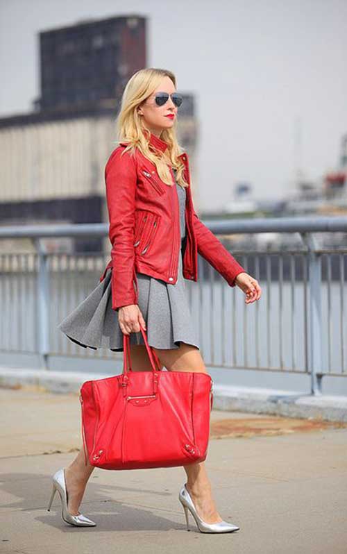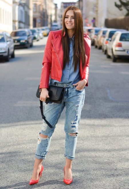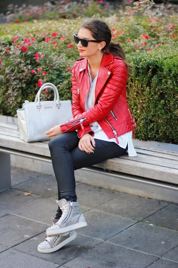 The right combination of color shoes with a red leather jacket will tell you about a woman who knows a lot about fashion. So, putting on a red leather jacket, shoe shoes or boots beige, black or brown. Soft, soothing colors will add style to your look. Bright shoes such as yellow, blue, orange, or red will ruin your look. The combination of loafers, ballet shoes, boyfriends will create a delightful bow. Still, stiletto shoes are the surest option.
