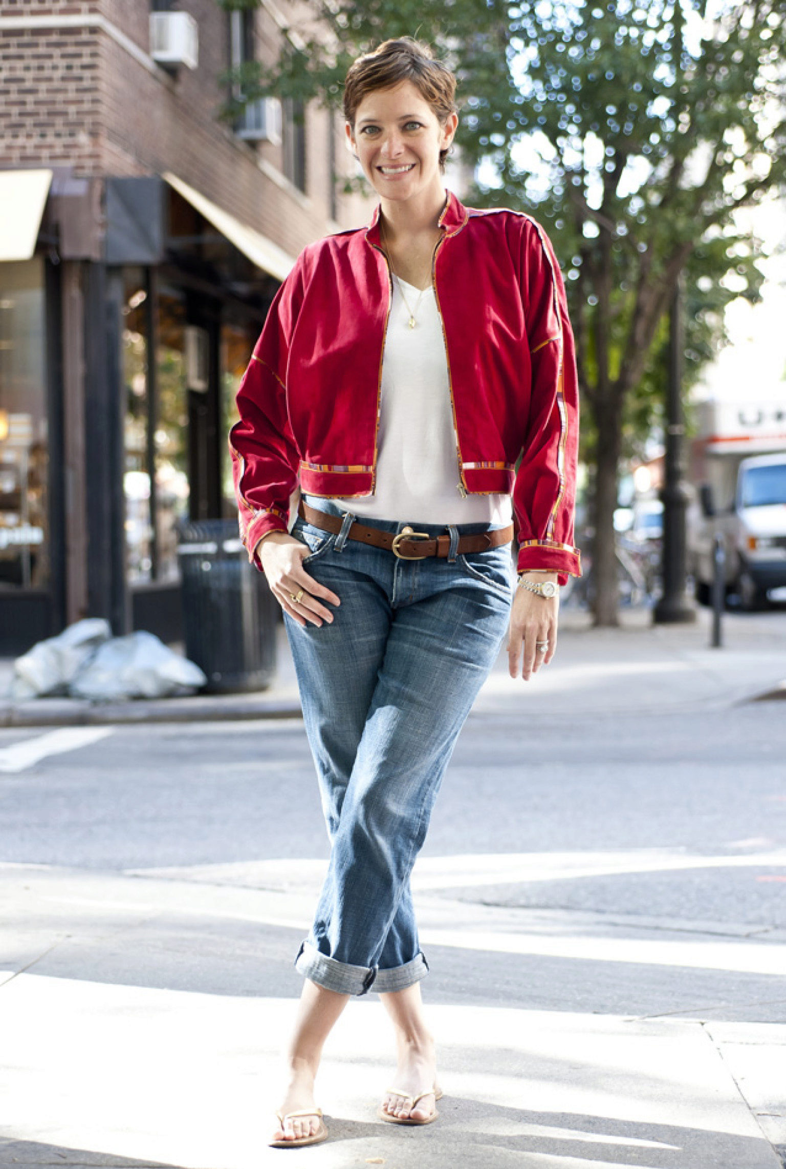 Shorts, a T-shirt in combination with a red jacket will make the image impudent