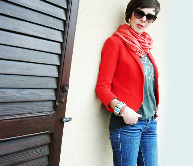 denim clothing with a red jacket and a bright accessory will highlight you
