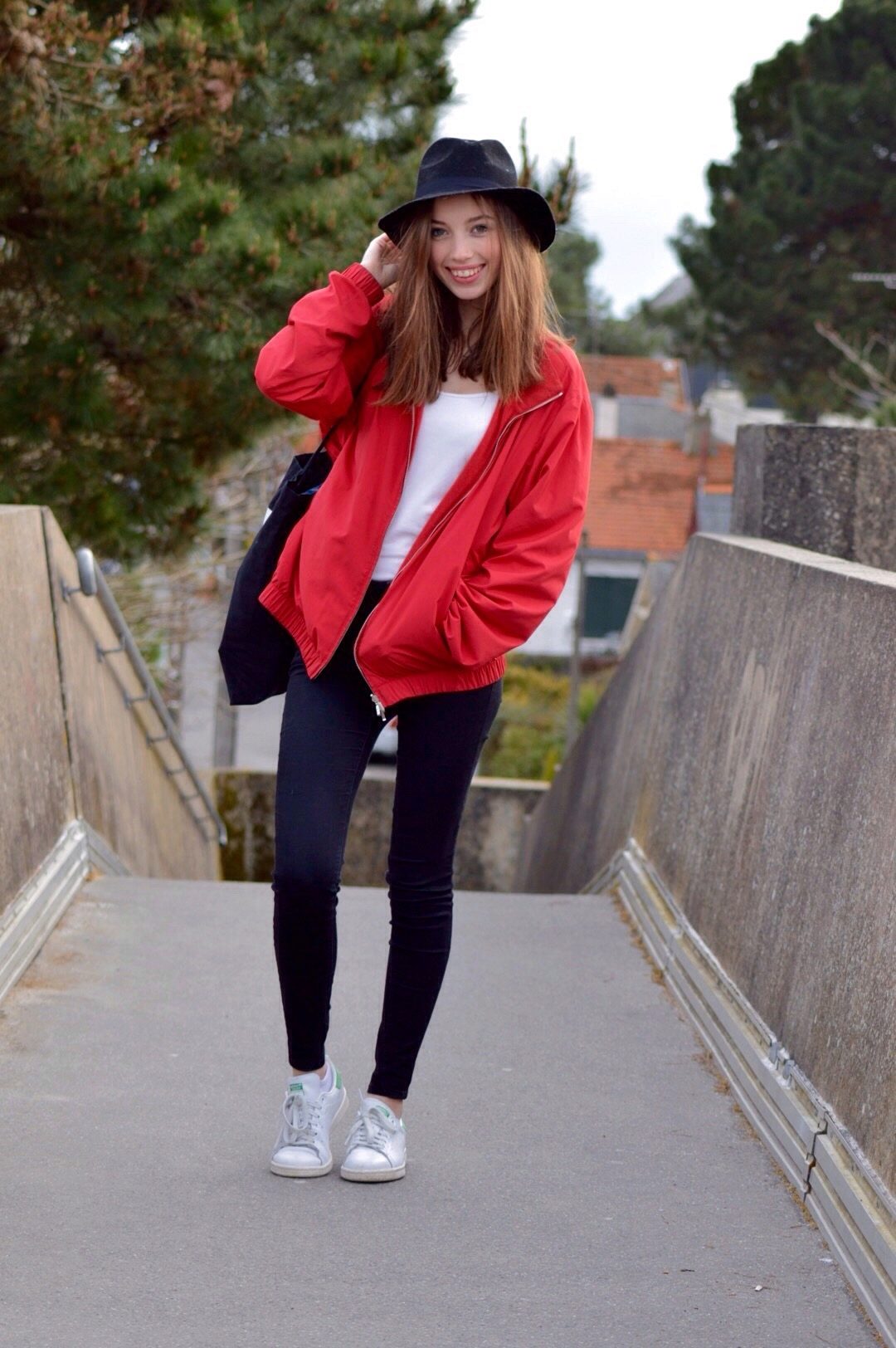 pastel colored sweatshirt, boyfriends and red jacket for everyday life