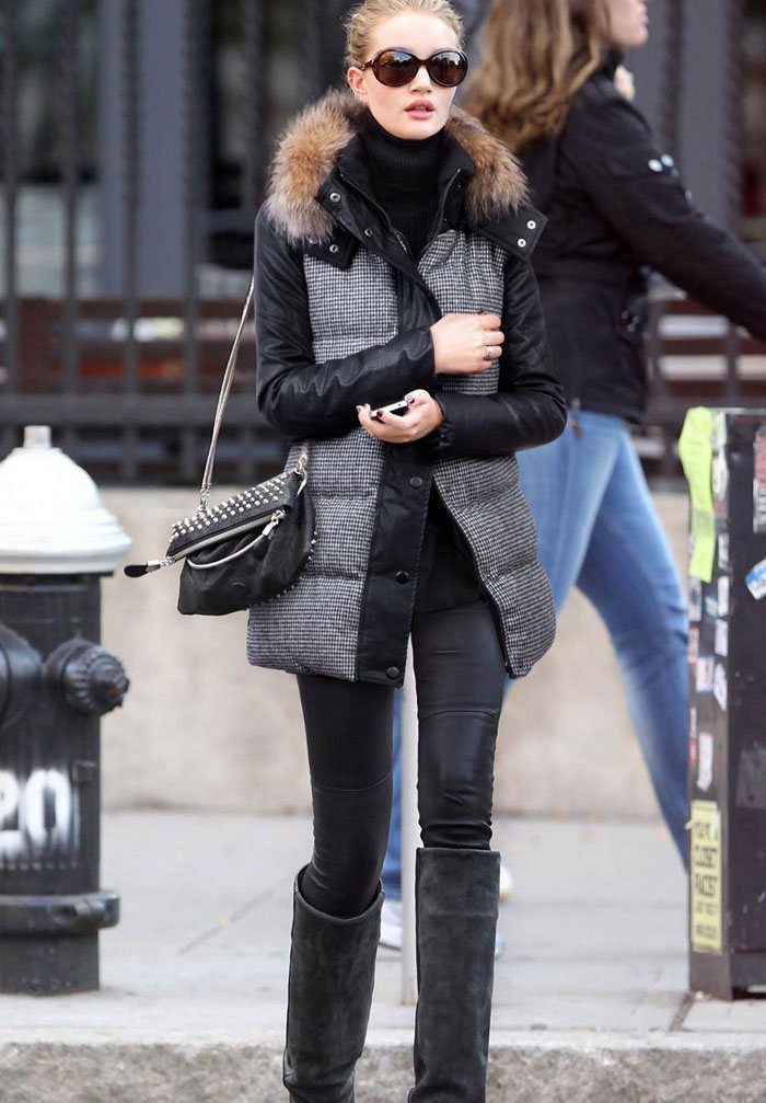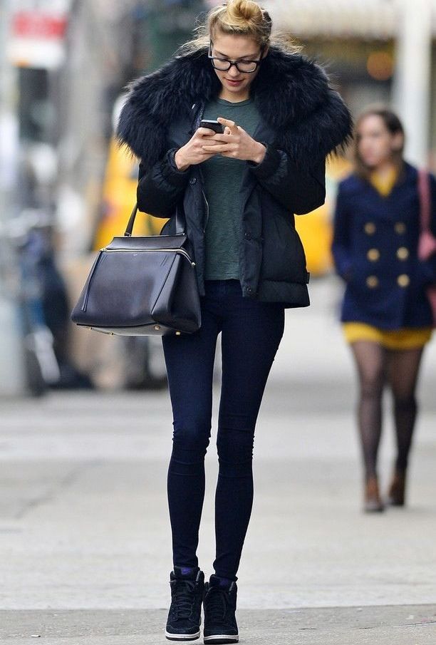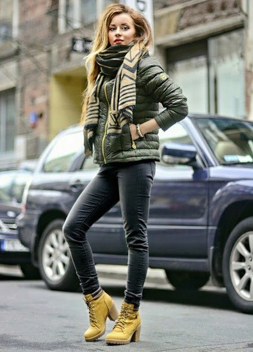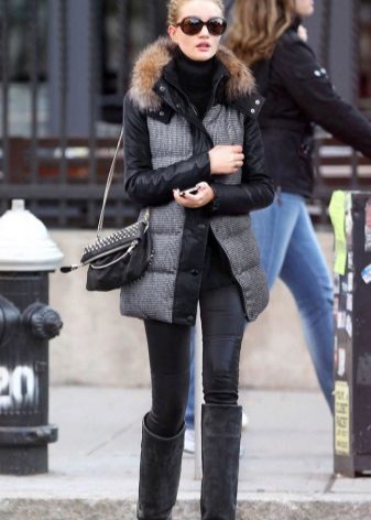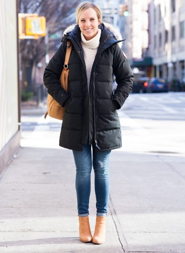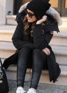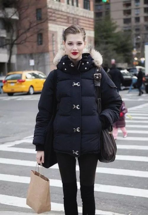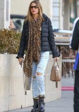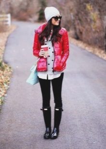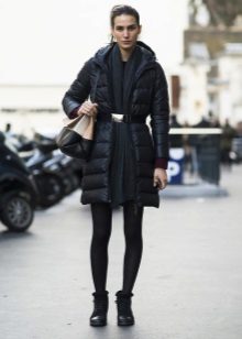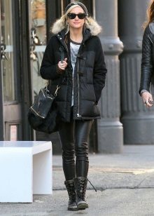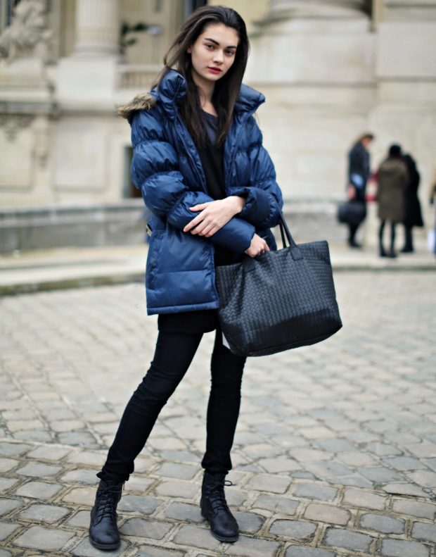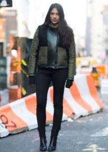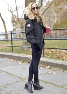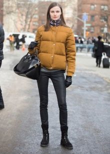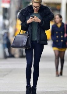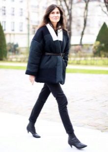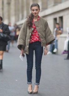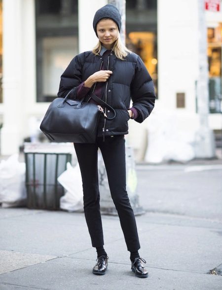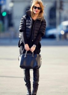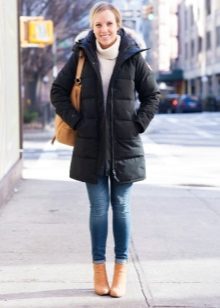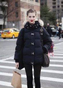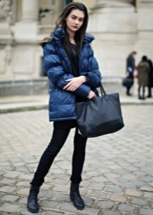 Best of all, the jacket looks with skinny jeans and flat-soled shoes. It can be boots, boots, high boots. Jeans can be easily replaced with leggings, trousers, a warmed skirt or a knitted dress.