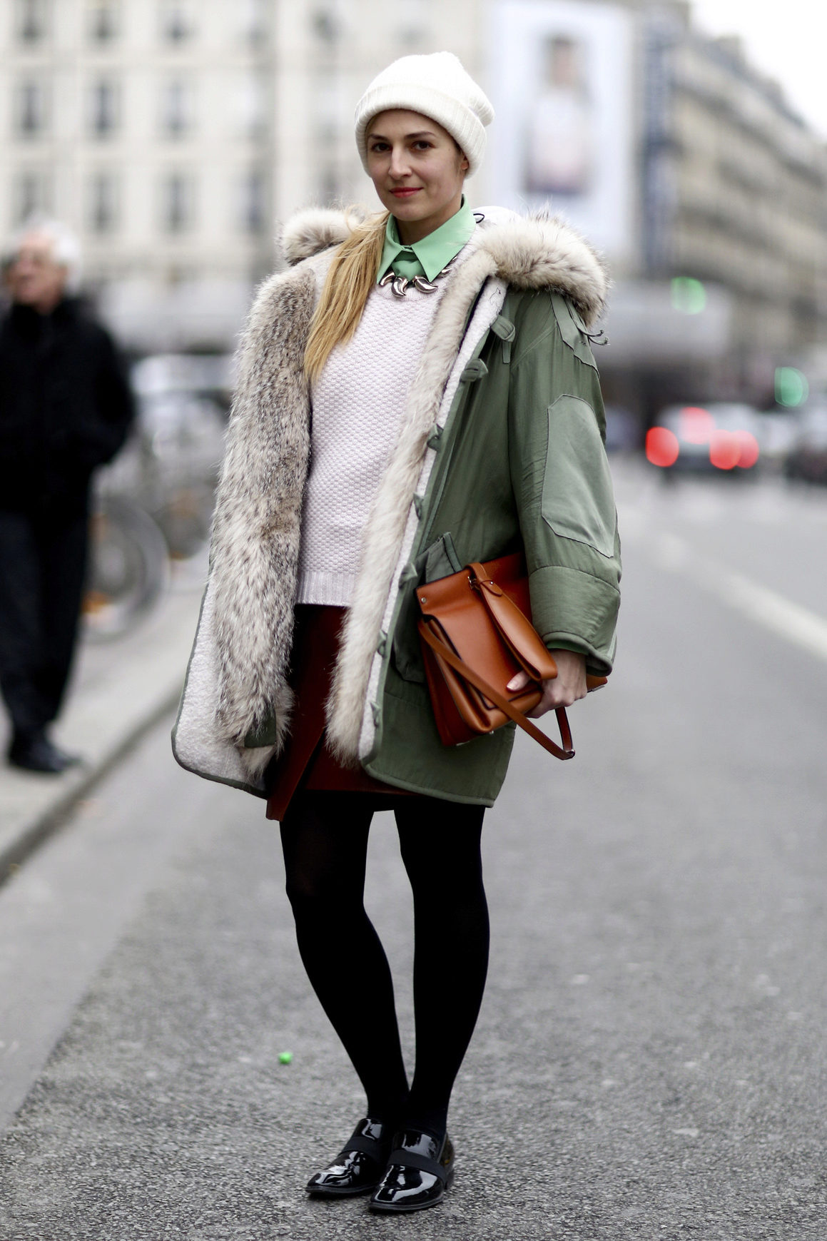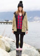 Since almost all parks have a hood, they often do not wear a hat with such a jacket at all. In bad weather to the park is to pick up a hat that will be neutral in style and style. An excellent option would be hats made of knitwear in a bright shade, but without finishing. It looks interesting with a park a warm cap, and in severe frosts such a jacket is perfectly combined with a large-knit hat.