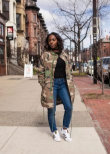 The park looks good with skinny, boyfriends and flared jeans, but a combination with jeans decorated with embroidery, rhinestones or similar bright décor is not considered very successful.