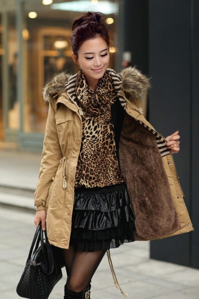 Parks in this style are both practical, comfortable and beautiful. Such models are often trimmed with natural fur and various decorative elements. There are also products made of shiny material that imitates silver or gold.
