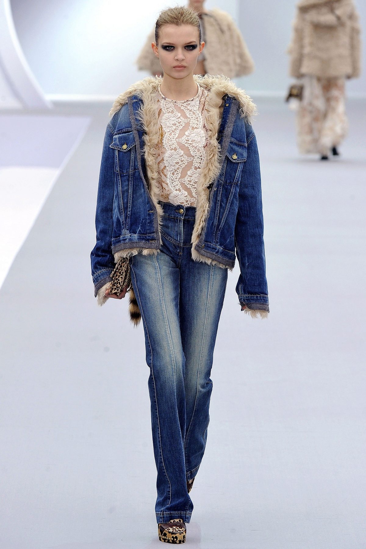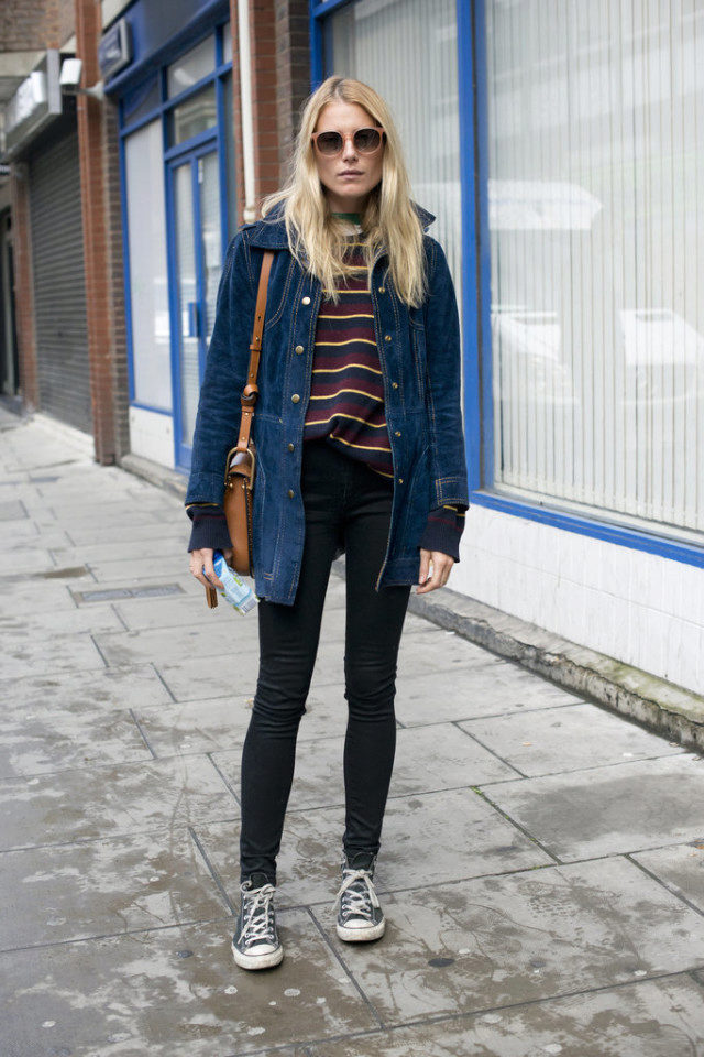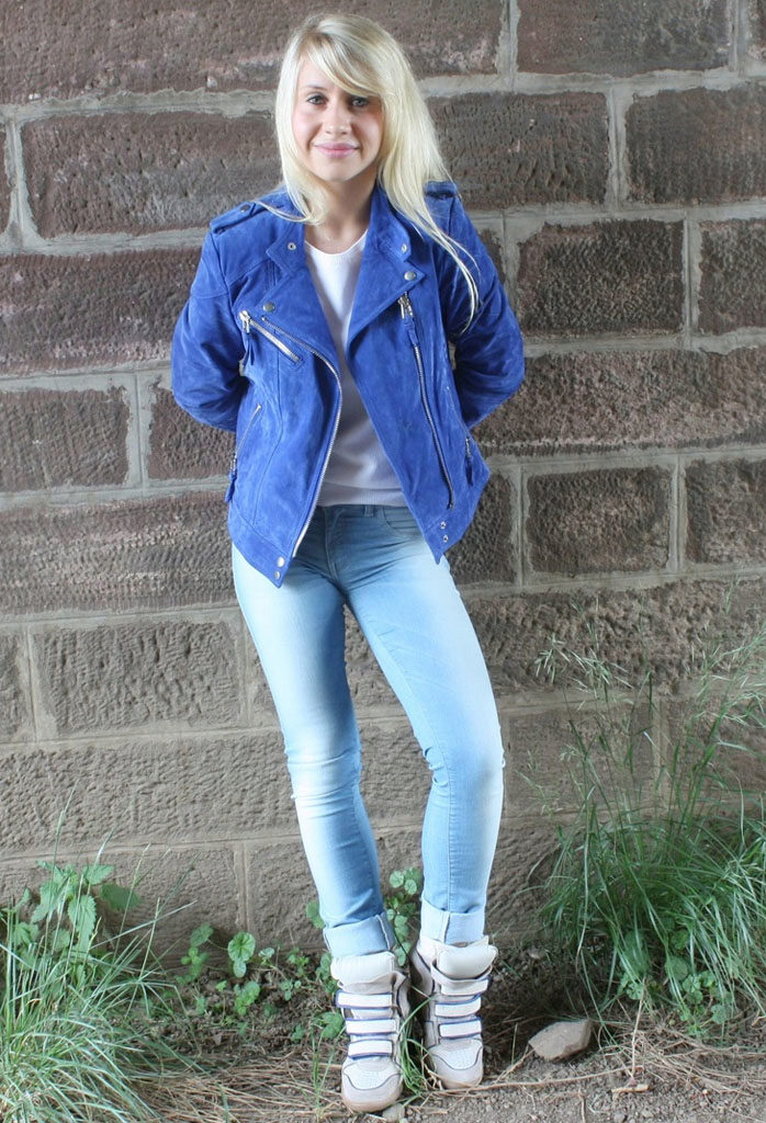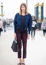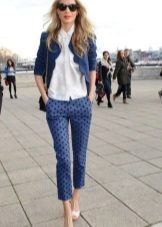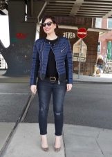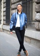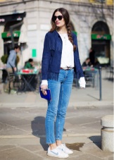 The blue jacket looks great with jeans of any style, especially with light models. A light chiffon blouse, a voluminous jumper or a t-shirt can serve as a top for this set.