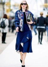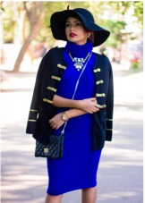 Sandals on wedges, pumps or ballet flats, as well as massive jewelry or elegant jewelry are selected for such an ensemble. Wearing a blue jacket with sheath-dress, be sure to choose bright accessories.