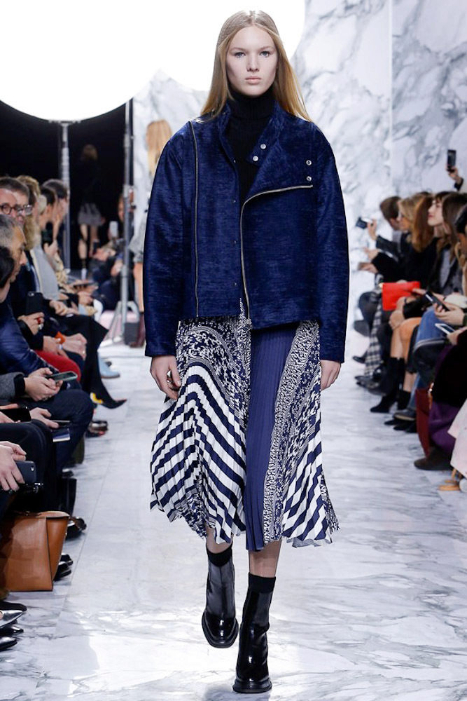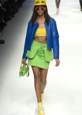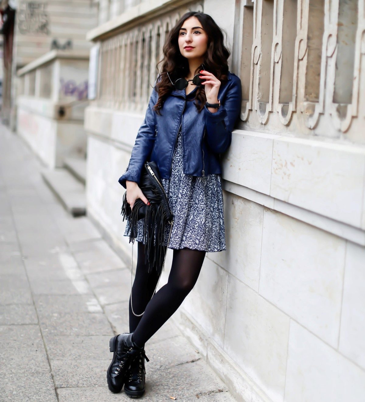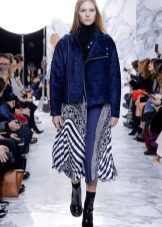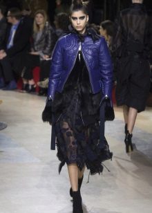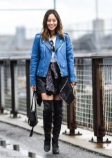 Looks good with a similar jacket and with dresses, with both plain and printed. A successful combination can be called a leather blue jacket and chiffon dress, as well as a chiffon skirt.