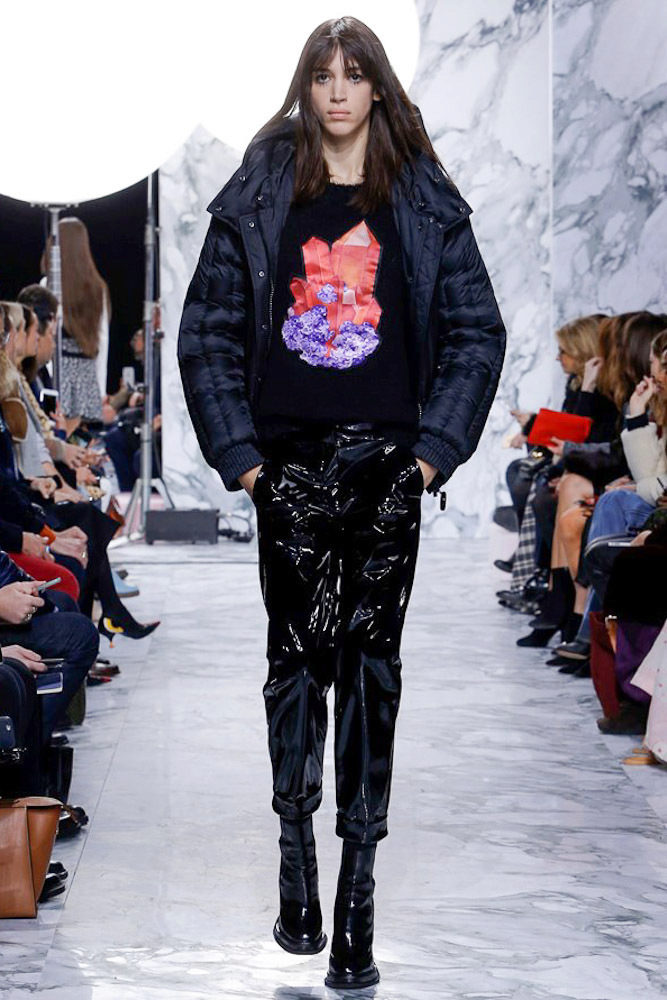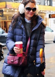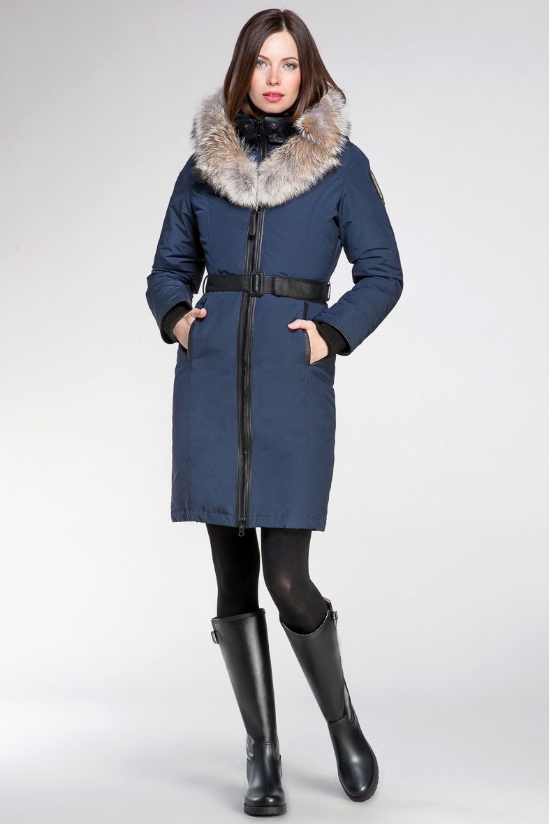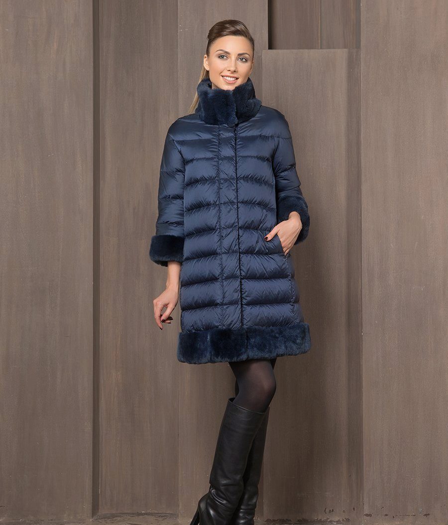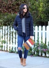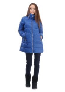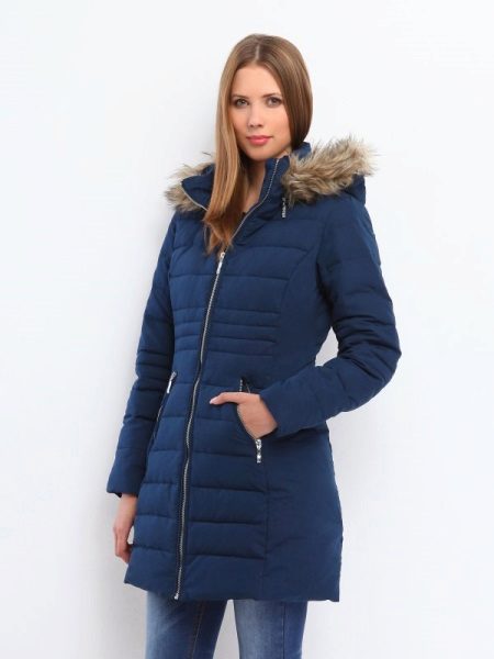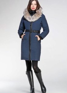 A warm blue jacket trimmed with fur is worn with jeans and tight tight pants. A short dress or mini-skirt can be worn under a long jacket, and black boots will be the most successful shoes in this case.