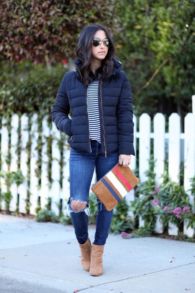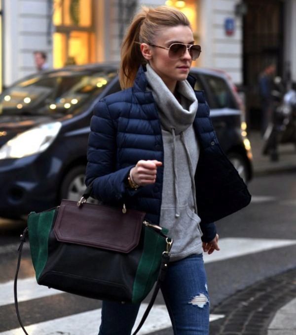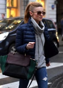 The best companions to the blue color of the jacket can be called white, gray, black and beige. The combination of blue and brown looks very harmonious.