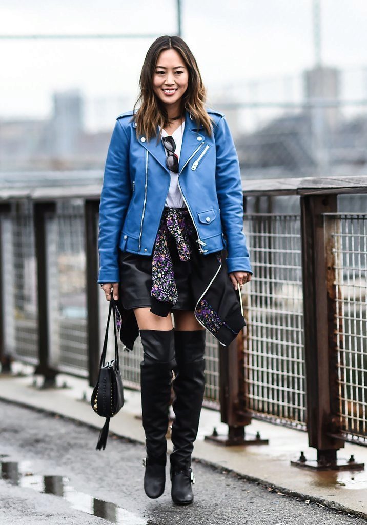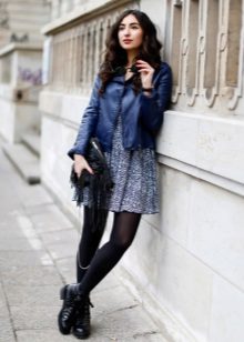 The combination of a short blue jacket with black shorts and a leather black skirt looks interesting. The outfit is complemented with a light sweater or golf, tight tights, shoes or heel shoes.