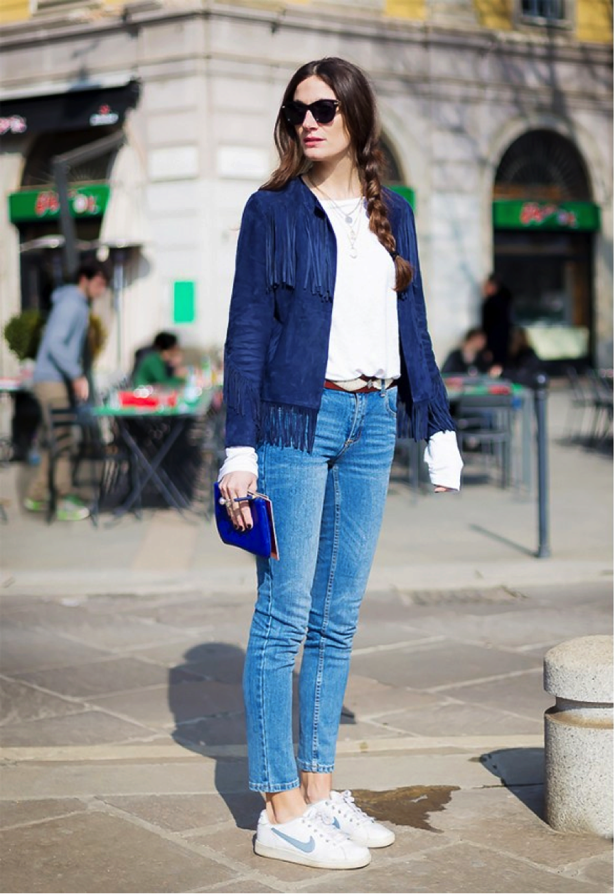 Shoes are selected depending on their preferences, as the jeans and blue jacket are well suited and the shoes, and sneakers, and ankle boots.