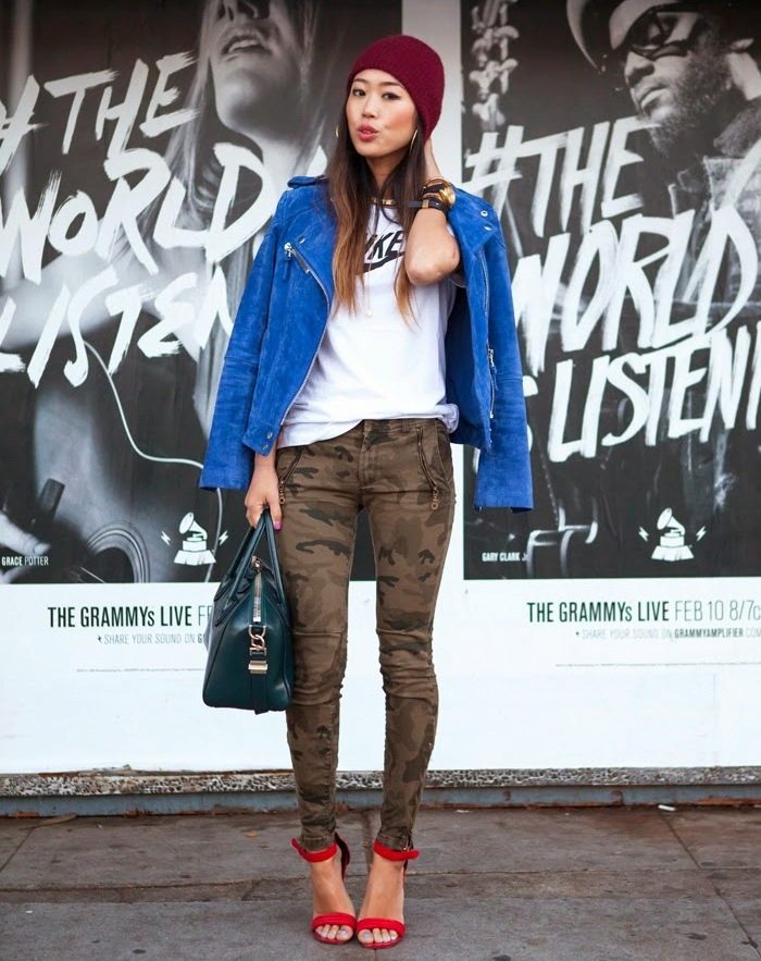 To get a stylish urban look, wear a blue leather jersey of a bright shade with blue jeans and a gray or white tank top or with black slim pants and a loose top.