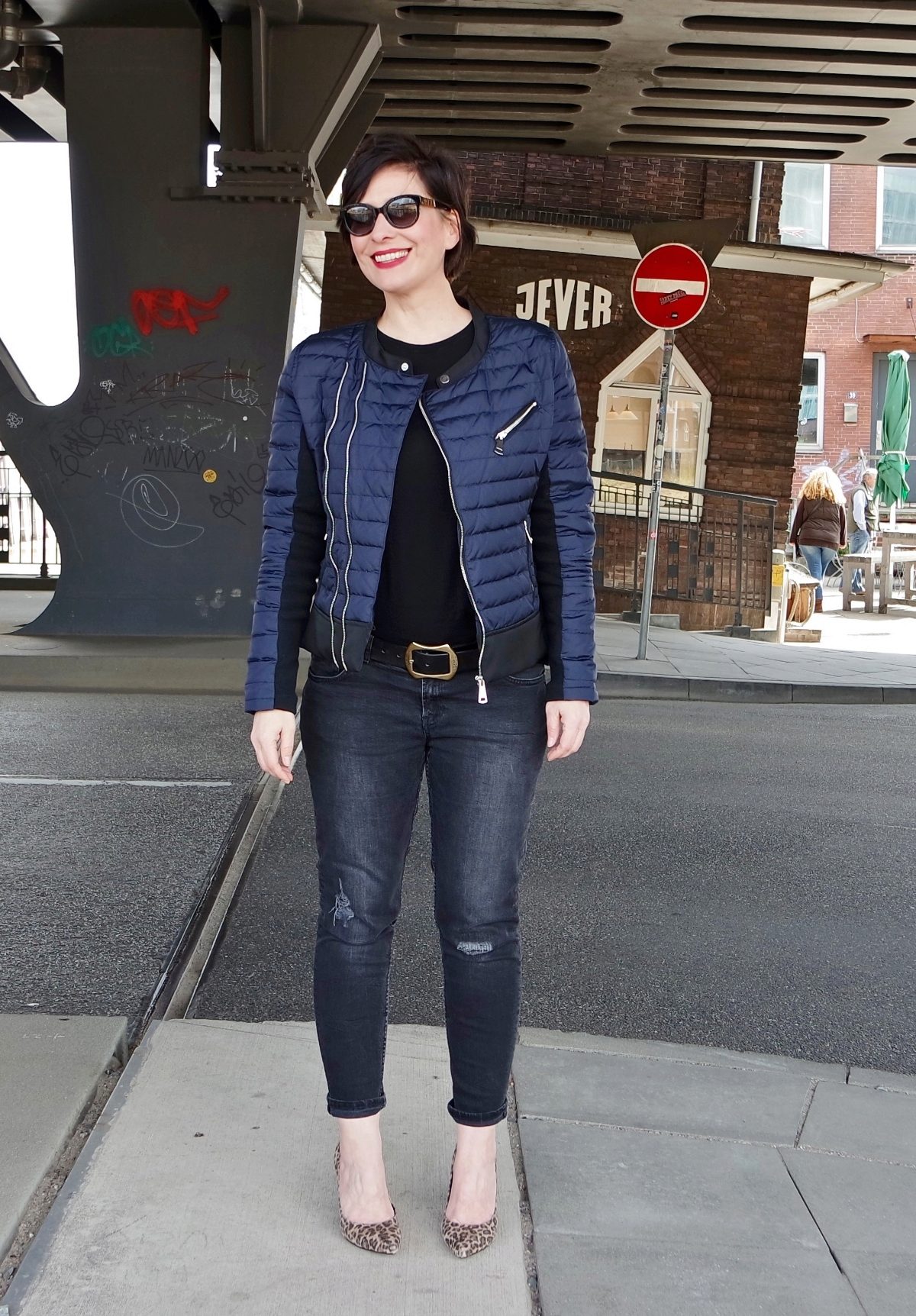 Demi blue sporty jackets look best with jeans. Under this jacket you can wear a thin light sweater or a shirt with a print.