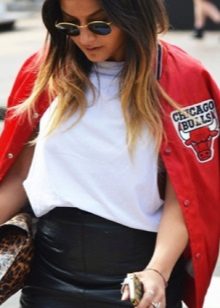 Under the jacket you can wear a comfortable sweatshirt, blouse, sweater, shirt or favorite jersey. There are no strict restrictions on this issue. Speaking of shoes, it is worth noting that ankle boots or boots with heels are perfect for a leather bomber. In the summer, it is not forbidden to wear ballet shoes or shoes on a small rise / stiletto. To the sports "bomber" fit a variety of sneakers or sneakers.