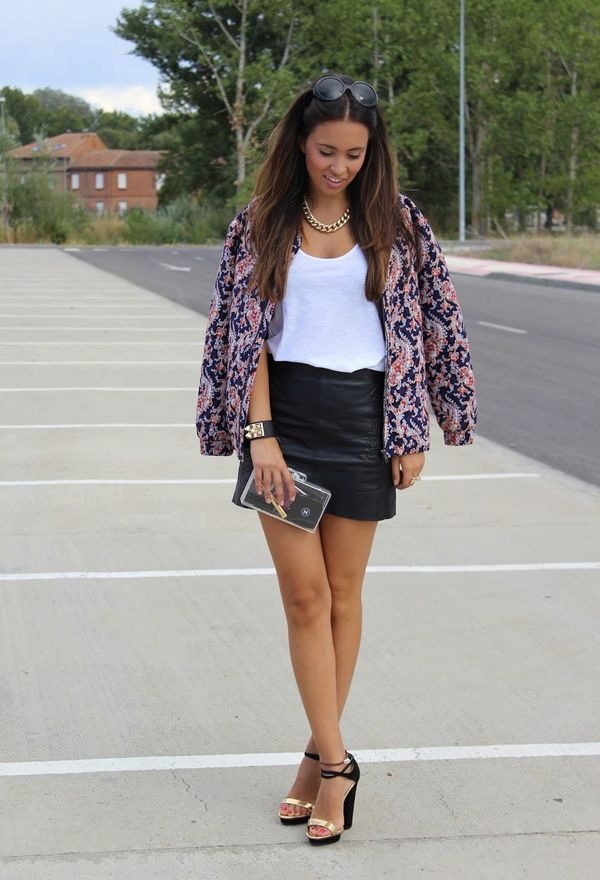 Dark-haired beauty shows us an unusual checkered version of a pilot's jacket with leather black sleeves. Such a bomber model is completely different from the classical one, reminiscent of tweed jackets and goes well with a skirt.