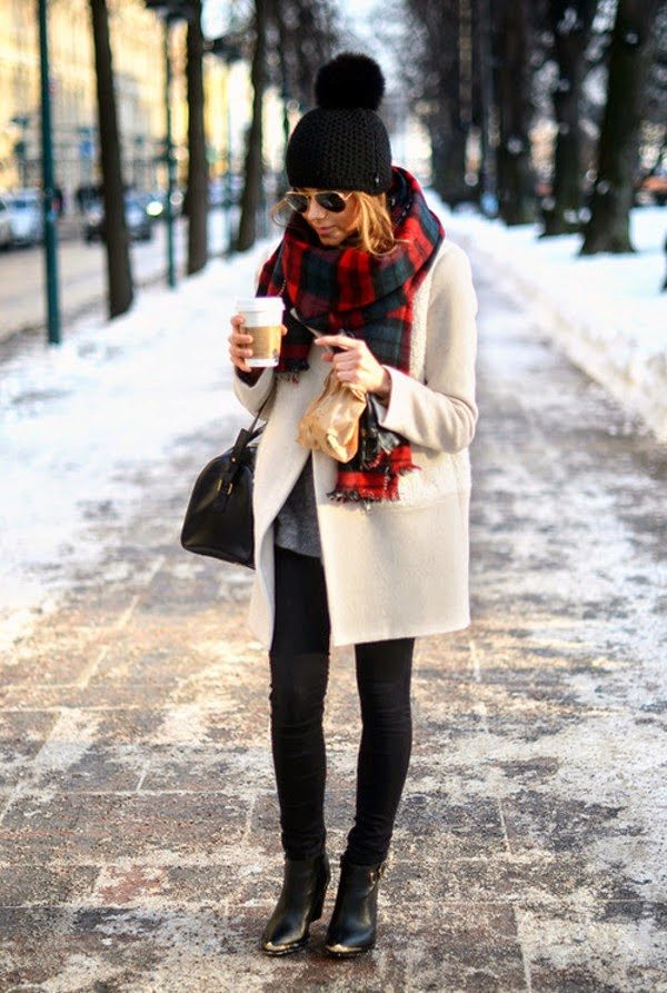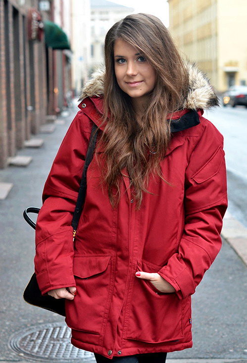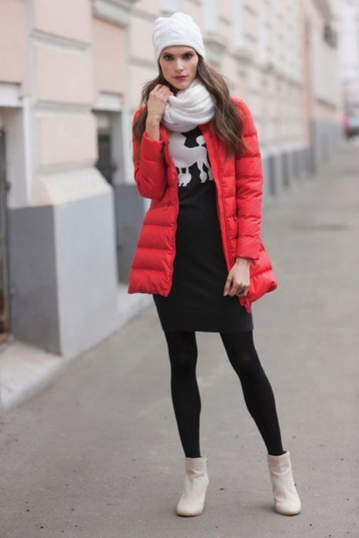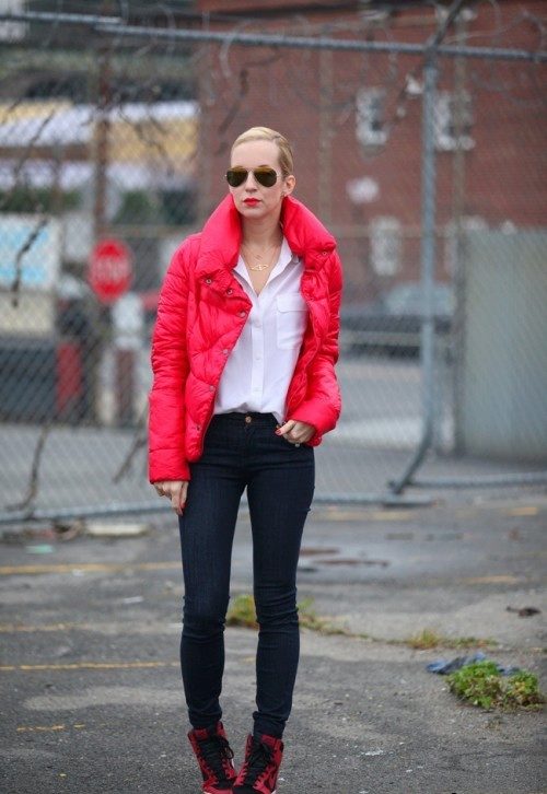 Bright red down jacket will accent any image. And in combination with the classic combination of white top and black bottom, it looks very lively and stylish. Sneakers on a high tank complement this trendy casual look.