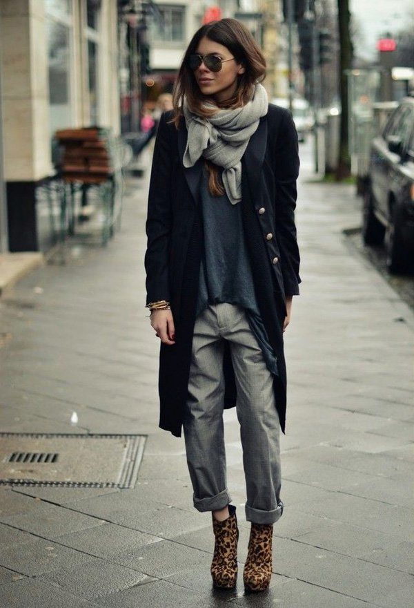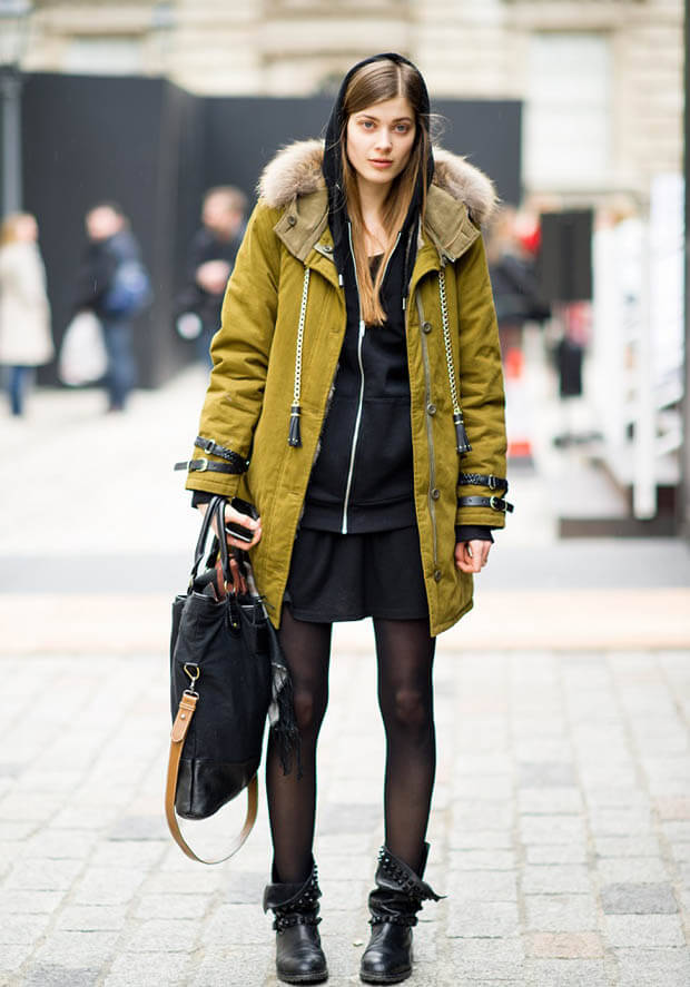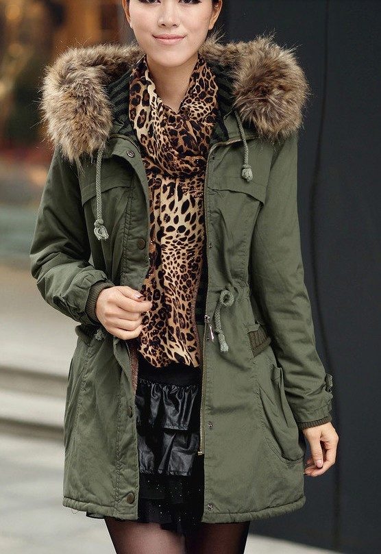 The militaristic style goes well with leopard print items. We see an example in the photo. The military orientation of outerwear brightly contrasts with a delicate scarf and an open miniskirt, highlighting all the feminine features of the model and emphasizing her individuality.