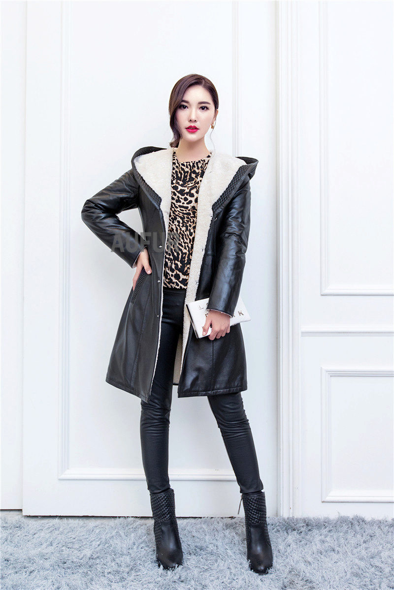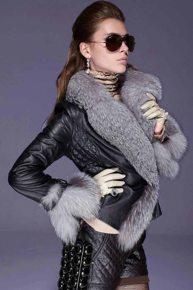 Leather jacket decorated with silver fox fur looks very impressive!