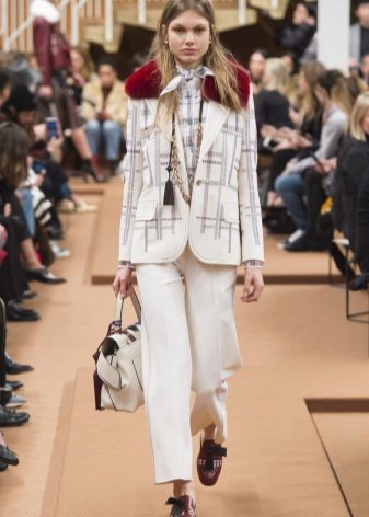- Straight trousers and a bomber jacket create a casual ensemble. In it you can go to work and for a walk. Bright accessories will help to make the image brighter.
