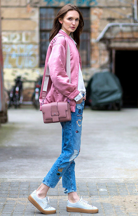 - With jeans, a bomber jacket looks youthful and at ease. Jeans are allowed almost any - skinny, pipes, straight or boyfriends. Casual style is, first of all, comfort and convenience. Therefore, we add cozy uggs or laconic shoes on a flat sole to jeans.
