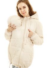 The difference between the main models of sling jackets and the usual ones is that there is a special insert in the front center of it that makes the jacket wider. This insert clips to the slinger with two zippers. It is necessary in order to wear the product during pregnancy or already directly with a child in a sling. The design of the insert is such that, if necessary, you can stick the head of the child out, while the mother's neck and chest will remain closed, as there is an additional detachable zipper between the neck of the mother and the neck of the child. On the inset there is often a convenient detachable, fitted with a drawstring hood for the baby.