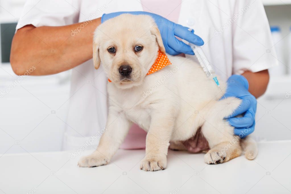 To combat infectious diseases, a Labrador Retriever puppy is vaccinated. Two weeks before vaccinations, the dog is rid of worms. Vaccination schedule should be checked with the vet and strictly follow it.
