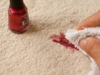 If the test reveals no problems, the product is applied to a clean rag or piece of cotton and gently blot the soiled nap. It is not worth rubbing a dirty place in order not to increase its area. The process is quite long, especially if the bright lacquer left a mark on the light carpet. Pouring the product onto the carpet should not be: this will contribute to the expansion of the pollution area. In addition, the fluid can damage the base of the carpet. To facilitate the work, it is recommended to periodically moisten the stain with water: it will not allow the contamination to dry out. You can finish cleaning with soapy water or a special carpet cleaner.