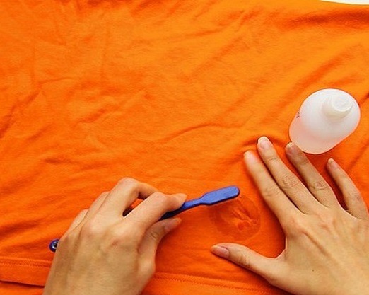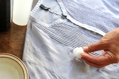 - Wet the sponge in ethyl alcohol. Blot the lacquer stain, then begin to rub it in a circular motion from the edges to the center. Do it from the inside, and put a piece of white matter on the front side. After the disappearance of the stains, wash the thing in the washing machine in the usual mode of washing.