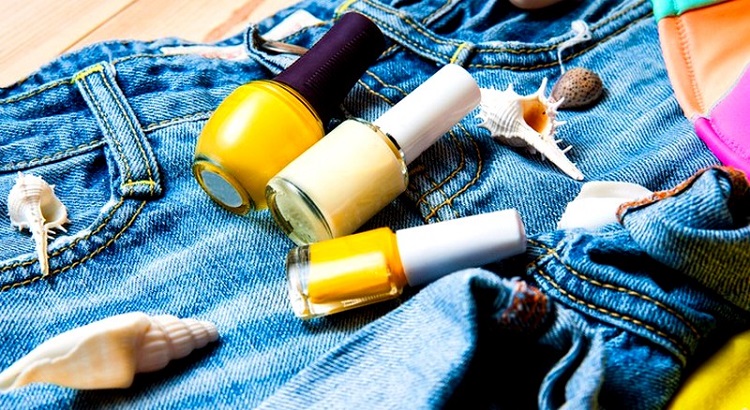 Jeans are made of a very special fabric. Remember the color of the water after the first wash of your jeans trousers - for sure it was inky blue. So, because of this dyeing of the fabric, it cannot be cleaned with aggressive agents with a whitening effect. You may remove the lacquer, but in its place there will be a bleached stain that you will hardly like more. Therefore, before proceeding to the processing of jeans with anything, try to apply the tool from the wrong side, in an inconspicuous area.