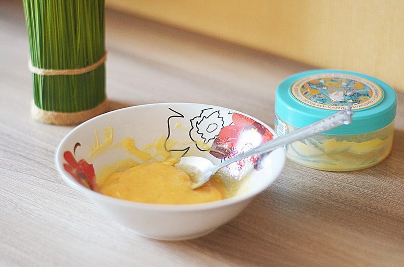 Both that and other recipe assumes similar application. Combine all the components and apply to hair, after half an hour, rinse them with warm water.