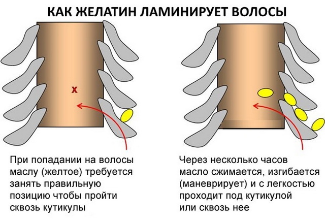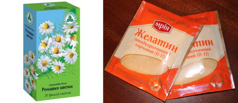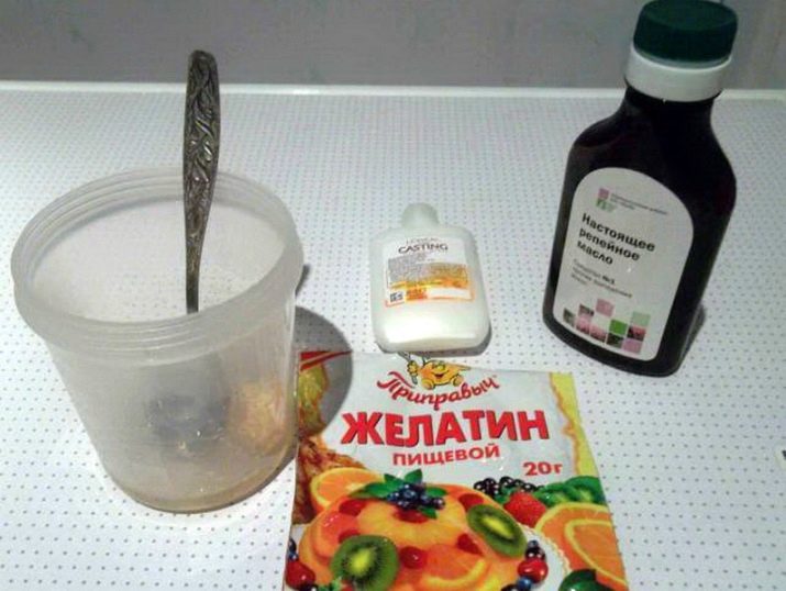 To strengthen the hair follicles, it is good to add half a teaspoon of castorca or burdock oil to the gelatin base. Keep the composition for an hour under a towel or a warm hat.
